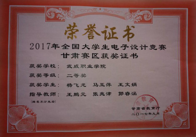 近日,2017年全國(guó)大學(xué)生電子設(shè)計(jì)競(jìng)賽甘肅賽區(qū)成績(jī)揭曉。由電子信息工程系2016級(jí)應(yīng)用電子技術(shù)專(zhuān)業(yè)楊飛龍、馬玉萍、王文娟3名同學(xué)組成的團(tuán)隊(duì)在我系王鵬元、張兆津、郭睿涵3名教師指導(dǎo)下榮獲甘肅賽區(qū)二等獎(jiǎng)。此次獲獎(jiǎng)也是我系在優(yōu)質(zhì)校建設(shè)中狠抓教學(xué)科研和學(xué)生技能培養(yǎng)方面取得的豐碩成果。