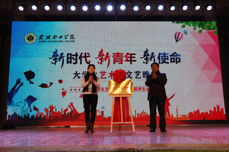 晚會開始前舉行了學(xué)院大學(xué)生藝術(shù)團成立揭牌儀式,黨委副書記趙明、副院長田迎春上臺為大學(xué)生藝術(shù)團揭牌。