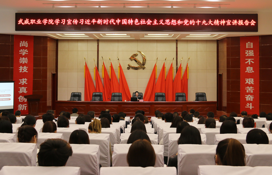為進(jìn)一步加強對習(xí)近平新時代中國特色社會主義思想和黨的十九大精神的學(xué)習(xí)宣傳教育,4月9日下午,學(xué)院黨委在菁英廳舉行“武威職業(yè)學(xué)院深入學(xué)習(xí)宣傳貫徹習(xí)近平新時代中國特色社會主義思想和黨的十九大精神宣講報告會”,邀請武威市委講師團(tuán)成員、市委黨校副教授蔡生菊為學(xué)院各院系師生代表、副科級以上領(lǐng)導(dǎo)干部、直屬附屬醫(yī)院領(lǐng)導(dǎo)共計200余人作宣講報告。宣講報告會由宣傳統(tǒng)戰(zhàn)部部長王繼林主持。