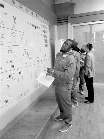 圖為該校2012級赤道幾內(nèi)亞留學(xué)生在故縣水利樞紐電站中控室進(jìn)行運行實習(xí)。