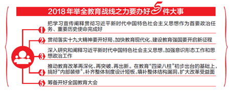 中國教育報(bào)北京1月24日訊(記者 柴葳)1月23日至24日,2018年全國教育工作會(huì)議在京召開。會(huì)議強(qiáng)調(diào),要全面貫徹黨的十九大精神,以習(xí)近平新時(shí)代中國特色社會(huì)主義思想為指導(dǎo),緊緊圍繞統(tǒng)籌推進(jìn)“五位一體”總體布局和協(xié)調(diào)推進(jìn)“四個(gè)全面”戰(zhàn)略布局,堅(jiān)持穩(wěn)中求進(jìn)總基調(diào),按照高質(zhì)量發(fā)展根本要求,貫徹黨的教育方針,推進(jìn)教育優(yōu)先發(fā)展,落實(shí)立德樹人根本任務(wù),深化教育改革,推進(jìn)教育公平,發(fā)展素質(zhì)教育,加快教育現(xiàn)代化,努力培養(yǎng)德智體美全面發(fā)展的社會(huì)主義建設(shè)者和接班人,培養(yǎng)擔(dān)當(dāng)民族復(fù)興大任的時(shí)代新人。