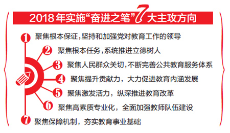 陳寶生指出,黨的十九大對(duì)教育工作作出了全面系統(tǒng)部署。在加快教育現(xiàn)代化、建設(shè)教育強(qiáng)國的新征程中,解決教育發(fā)展不平衡不充分的問題將是我們長期要面對(duì)的工作主題。要以問題為導(dǎo)向,將其作為實(shí)施“奮進(jìn)之筆”的著力點(diǎn)和主攻方向。一是聚焦根本保證,堅(jiān)持和加強(qiáng)黨對(duì)教育工作的領(lǐng)導(dǎo)。要把黨的政治建設(shè)擺在首位,狠抓大抓基層黨組織建設(shè),持之以恒正風(fēng)肅紀(jì),抓好意識(shí)形態(tài)工作。二是聚焦根本任務(wù),系統(tǒng)推進(jìn)立德樹人。要把德育擺在更加重要的位置,堅(jiān)定青少年理想信念,改進(jìn)和加強(qiáng)思想政治工作,大力發(fā)展素質(zhì)教育,加強(qiáng)語言文字工作。三是聚焦人民群眾關(guān)切,不斷完善公共教育服務(wù)體系。要促進(jìn)學(xué)前教育普惠健康發(fā)展,加快城鄉(xiāng)義務(wù)教育一體化發(fā)展步伐,加大普及高中階段教育攻堅(jiān)力度,加大對(duì)困難地區(qū)扶持力度,切實(shí)加強(qiáng)校園安全。四是聚焦提升貢獻(xiàn)力,大力促進(jìn)教育內(nèi)涵發(fā)展。要以質(zhì)量為本,持續(xù)推進(jìn)職業(yè)教育質(zhì)量提升,健全高等教育內(nèi)涵發(fā)展政策機(jī)制,辦好繼續(xù)教育。五是聚焦激發(fā)活力,縱深推進(jìn)教育改革。要深化“放管服”改革,實(shí)施考招改革“拓展深化”攻堅(jiān)行動(dòng),支持和規(guī)范社會(huì)力量興辦教育,堅(jiān)定不移以開放促改革。六是聚焦高素質(zhì)專業(yè)化,全面加強(qiáng)教師隊(duì)伍建設(shè)。實(shí)施教師隊(duì)伍“建設(shè)改革”攻堅(jiān)行動(dòng),健全師德師風(fēng)建設(shè)長效機(jī)制,完善教師管理制度,提升教師獲得感、幸福感和榮譽(yù)感。七是聚焦保障機(jī)制,夯實(shí)教育事業(yè)基礎(chǔ)。要落實(shí)教育投入責(zé)任,加快教育信息化步伐,全力推進(jìn)依法治教。