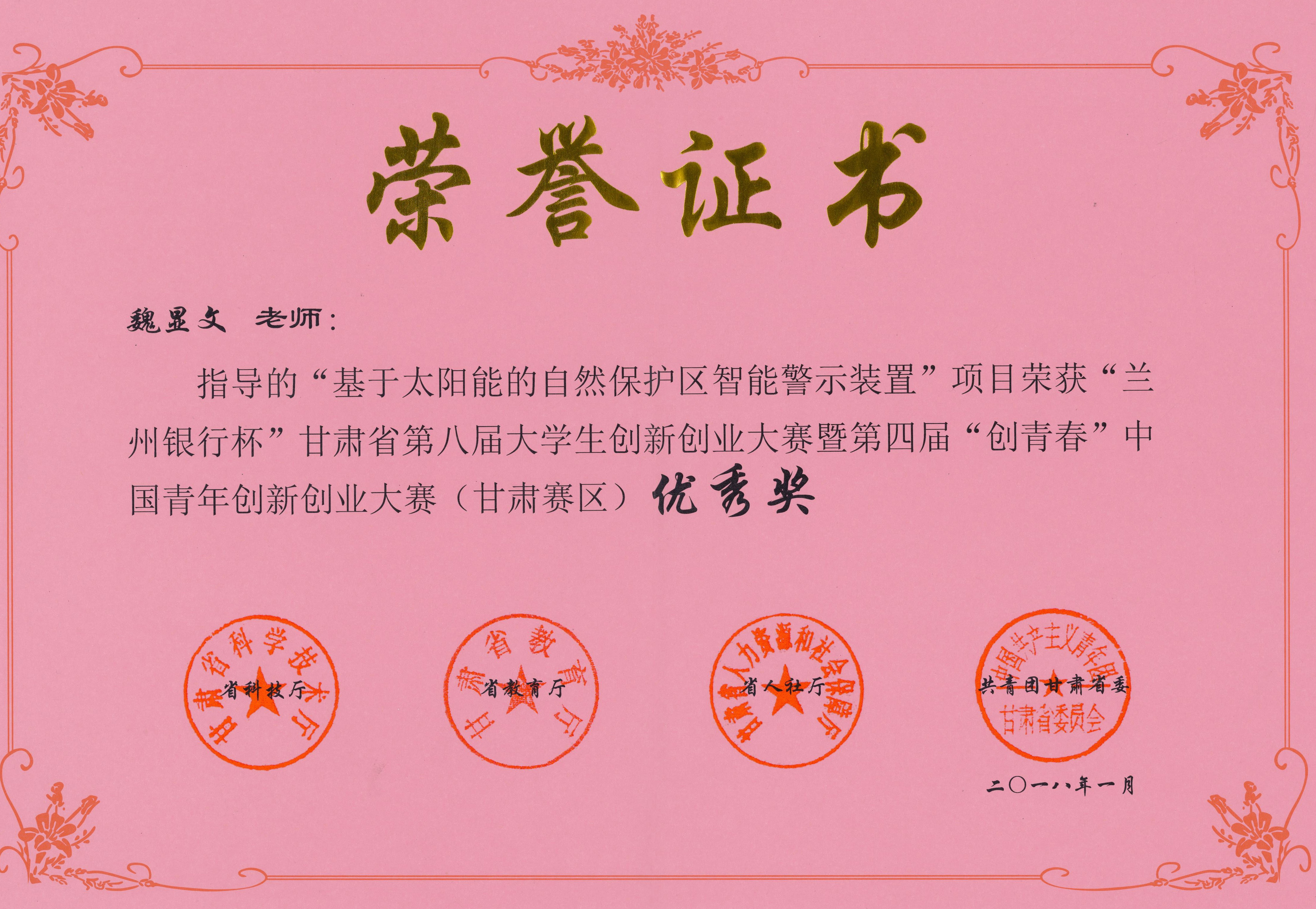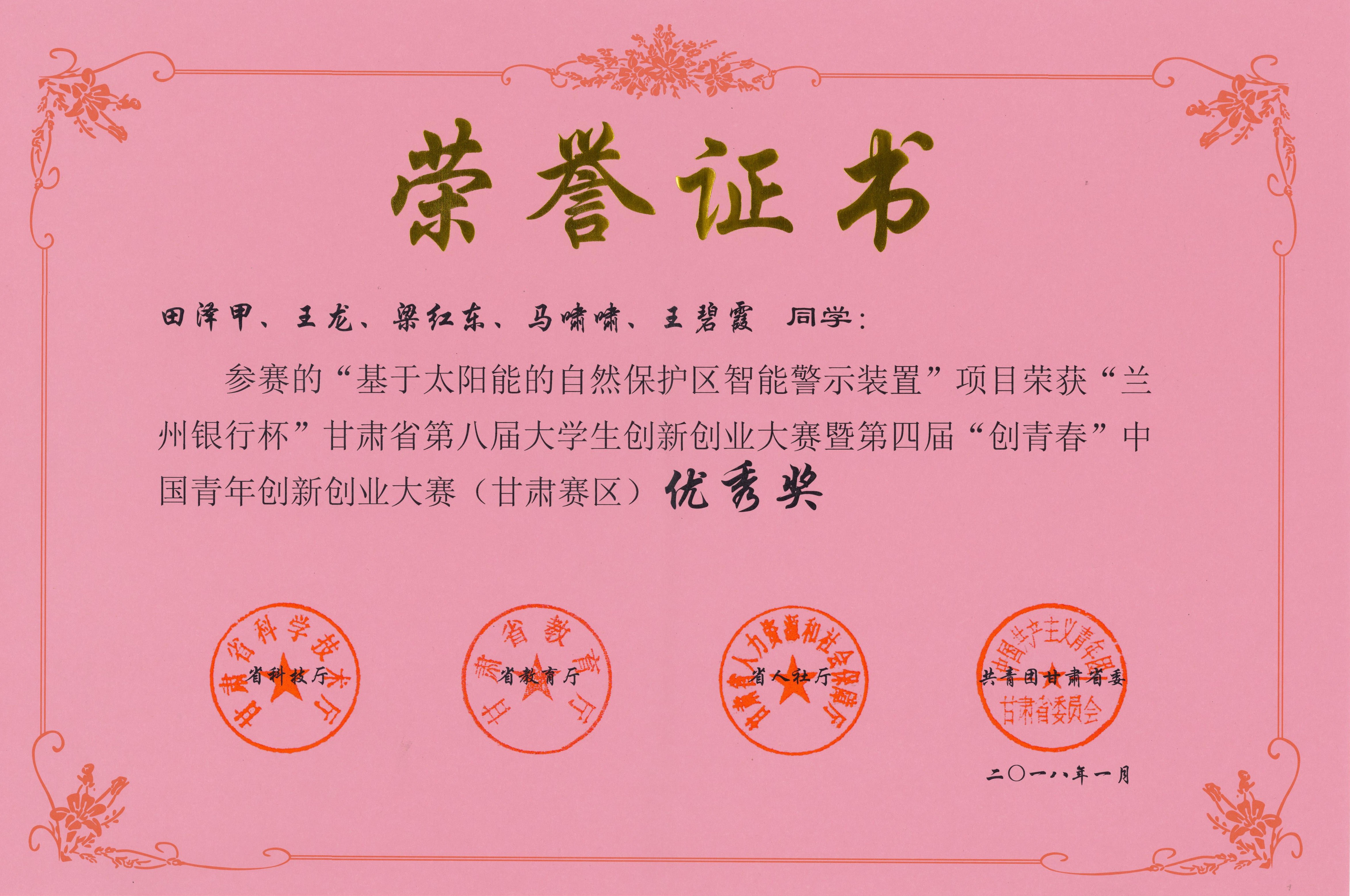 近日,從省教育廳、省科技廳、省人力資源和社會(huì)保障廳、共青團(tuán)甘肅省委聯(lián)合下發(fā)的《關(guān)于公布“蘭州銀行杯”甘肅省第八屆大學(xué)生創(chuàng)新創(chuàng)業(yè)大賽暨第四屆“創(chuàng)青春”中國(guó)青年創(chuàng)新創(chuàng)業(yè)大賽(甘肅賽區(qū))獲獎(jiǎng)名單的通知》中獲知,在今年1月7日舉辦的“蘭州銀行杯”甘肅省第八屆大學(xué)生創(chuàng)新創(chuàng)業(yè)大賽暨第四屆“創(chuàng)青春”中國(guó)青年創(chuàng)新創(chuàng)業(yè)大賽(甘肅賽區(qū))中,我院選送的“基于太陽(yáng)能的自然保護(hù)區(qū)智能警示裝置”項(xiàng)目獲得優(yōu)秀獎(jiǎng)。