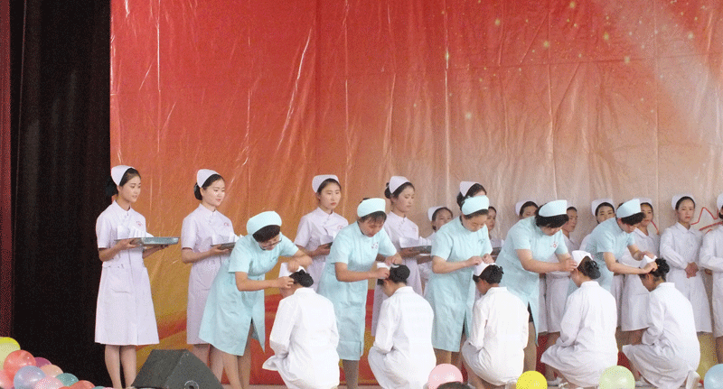 在慶祝活動(dòng)中,2015級(jí)畢業(yè)生代表進(jìn)行“心肺復(fù)蘇技術(shù)”及“右踝關(guān)節(jié)扭傷包扎技術(shù)”表演, 舉行了文藝演出,向全體觀眾展示了護(hù)理系學(xué)生的精神風(fēng)貌與才藝。