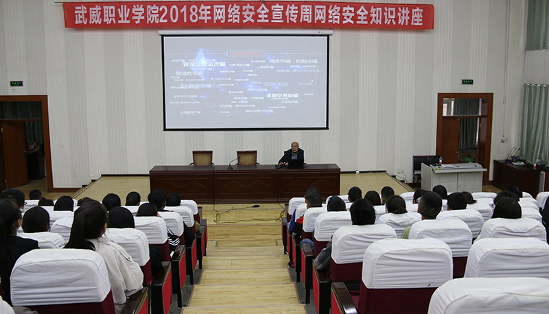 為深入學(xué)習(xí)宣傳貫徹習(xí)近平總書記在全國(guó)網(wǎng)絡(luò)安全和信息化工作會(huì)議上“深入開展網(wǎng)絡(luò)安全知識(shí)技能宣傳普及,提高廣大人民群眾網(wǎng)絡(luò)安全意識(shí)和防護(hù)技能”的重要講話精神,按照甘肅省教育廳、武威市網(wǎng)信辦關(guān)于開展2018年國(guó)家網(wǎng)絡(luò)安全宣傳周活動(dòng)的要求。9月18日下午,學(xué)院在正德廳舉辦了“網(wǎng)絡(luò)安全與《網(wǎng)絡(luò)安全法》”的專題講座,師生代表200余人參加。