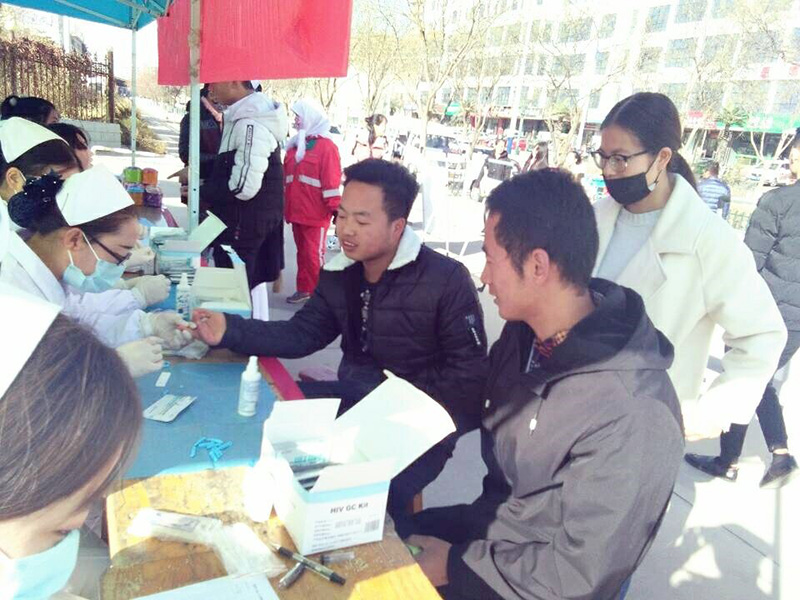 11月17日開始利用周末時(shí)間在武威文化廣場、武威職業(yè)學(xué)院門口等地開展了免費(fèi)檢測艾滋病與知艾防艾知識宣傳活動(dòng)?;顒?dòng)吸引了廣大師生及路人,組織井然有序,活動(dòng)場面顯得忙而不亂。在護(hù)理系紅絲帶協(xié)會(huì)志愿者與武威市疾控中心人員嫻熟的操作下,通過指尖采血,HIV病毒膠體金法檢測,共檢測了80余人,檢測速度快,精準(zhǔn)度高。檢測結(jié)束后,向檢測者贈(zèng)送活動(dòng)宣傳紀(jì)念品。此次檢測活動(dòng)采取保密制,保護(hù)檢測者的一切信息。