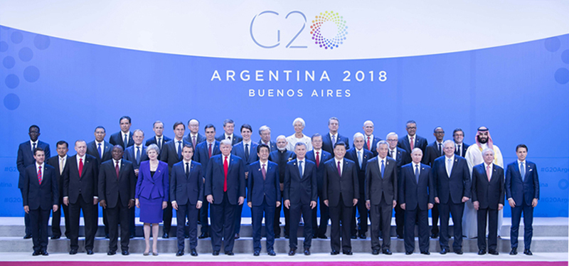當(dāng)?shù)貢r(shí)間11月30日,二十國(guó)集團(tuán)領(lǐng)導(dǎo)人第十三次峰會(huì)在阿根廷布宜諾斯艾利斯舉行。國(guó)家主席習(xí)近平出席第一階段會(huì)議并發(fā)表題為《登高望遠(yuǎn),牢牢把握世界經(jīng)濟(jì)正確方向》的重要講話。這是習(xí)近平同其他與會(huì)領(lǐng)導(dǎo)人合影。 新華社記者 李濤 攝