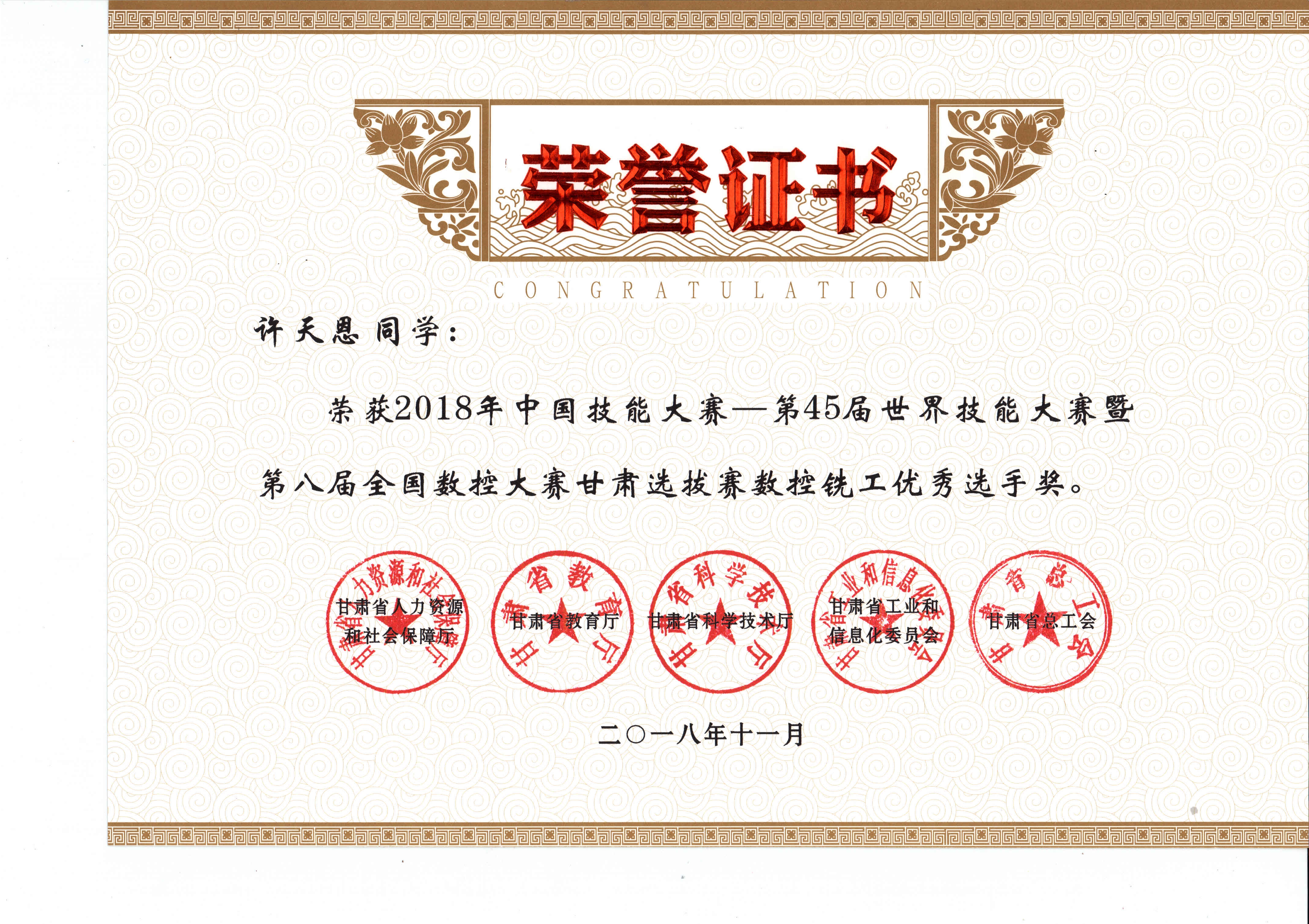 2018年中國(guó)技能大賽--第45屆世界技能大賽暨第八屆全國(guó)數(shù)控大賽甘肅選拔賽(數(shù)控銑工項(xiàng)目)獲獎(jiǎng)證書(shū)