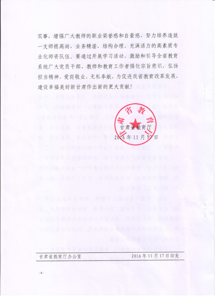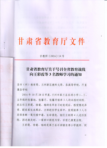 現(xiàn)將《甘肅省教育廳關(guān)于號召全省教育戰(zhàn)線向王彩霞等3名教師學習的通知》復印給你們,請認真組織所屬教職工學習王彩霞、徐菊 、楊玲3名教師愛崗敬業(yè)、無私奉獻、愛心救人的先進事跡。積極在院團委、系團總支,輔導員和班主任等學生管理隊伍中展開學習研討活動,深入踐行社會主義核心價值觀,切實加強學院意識形態(tài)領(lǐng)域工作,唱響主旋律,大力弘揚正能量。