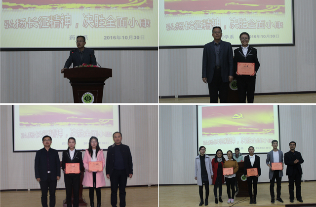 為紀(jì)念紅軍長征勝利80周年,激發(fā)師生弘揚偉大的長征精神,同時為豐富校園文化生活,展示青春正能量,藥學(xué)系團總支依據(jù)院團委的通知精神和系團學(xué)工作委員會關(guān)于增加學(xué)生課余活動的會議要求,于10月30日在正德廳組織開展了“傳承長征精神,筑我青春夢想”主題演講比賽。藥學(xué)系主任魏潤明出席了本次活動,各班班主任擔(dān)任本次比賽評委,2016級全體學(xué)生和2015級各班學(xué)生代表觀看了比賽。