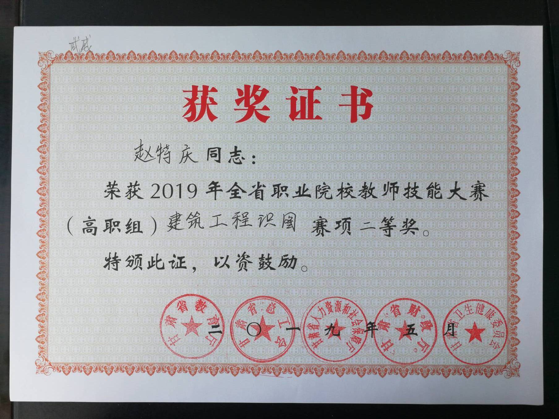 4月12 -14日,由甘肅省教育廳主辦的2019年全省職業(yè)院校教師技能大賽“建筑工程識(shí)圖”賽項(xiàng)在甘肅建筑職業(yè)技術(shù)學(xué)院舉辦。此次大賽有來自全省各地州市12所院校的21支代表隊(duì)42名選手參加。由我院建筑工程系趙特慶、王鵬老師組成的武威職業(yè)學(xué)院代表隊(duì)榮獲團(tuán)體二等獎(jiǎng)。