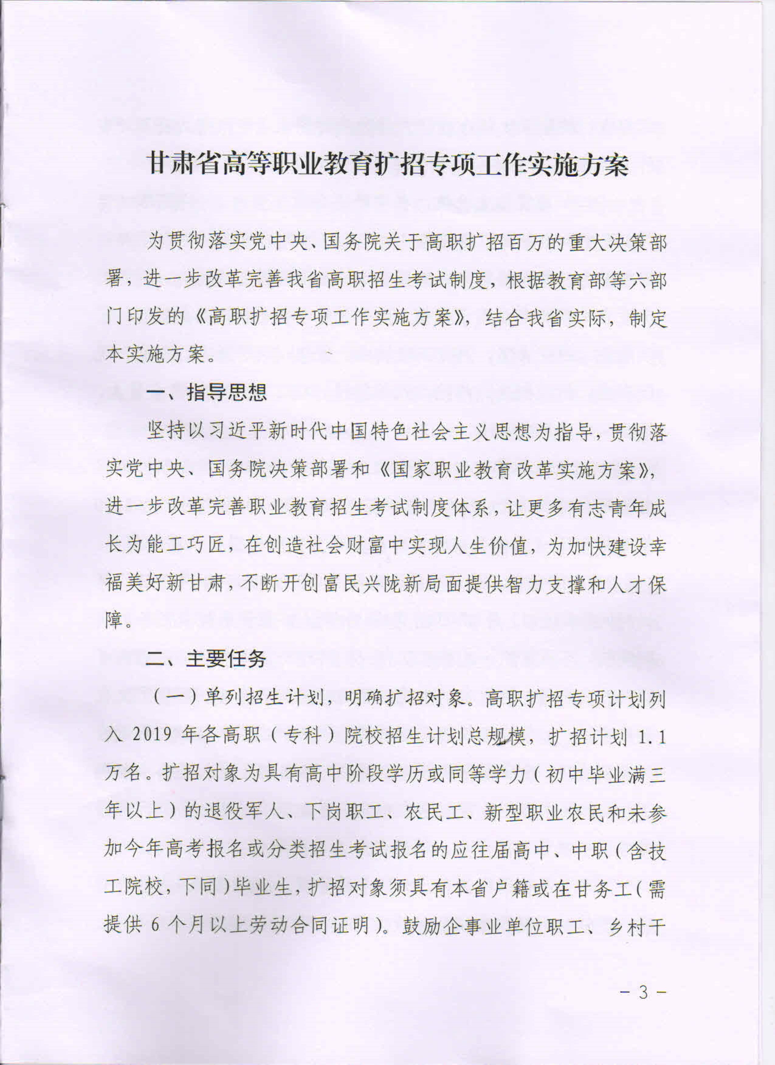 甘肅省高等職業(yè)教育擴(kuò)招專項(xiàng)工作實(shí)施方案