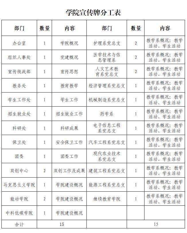 見“學院宣傳牌分工表”。數(shù)量不夠或者表中未涉及到的部門、單位,如果需要可另行向宣傳統(tǒng)戰(zhàn)部提出申請。
