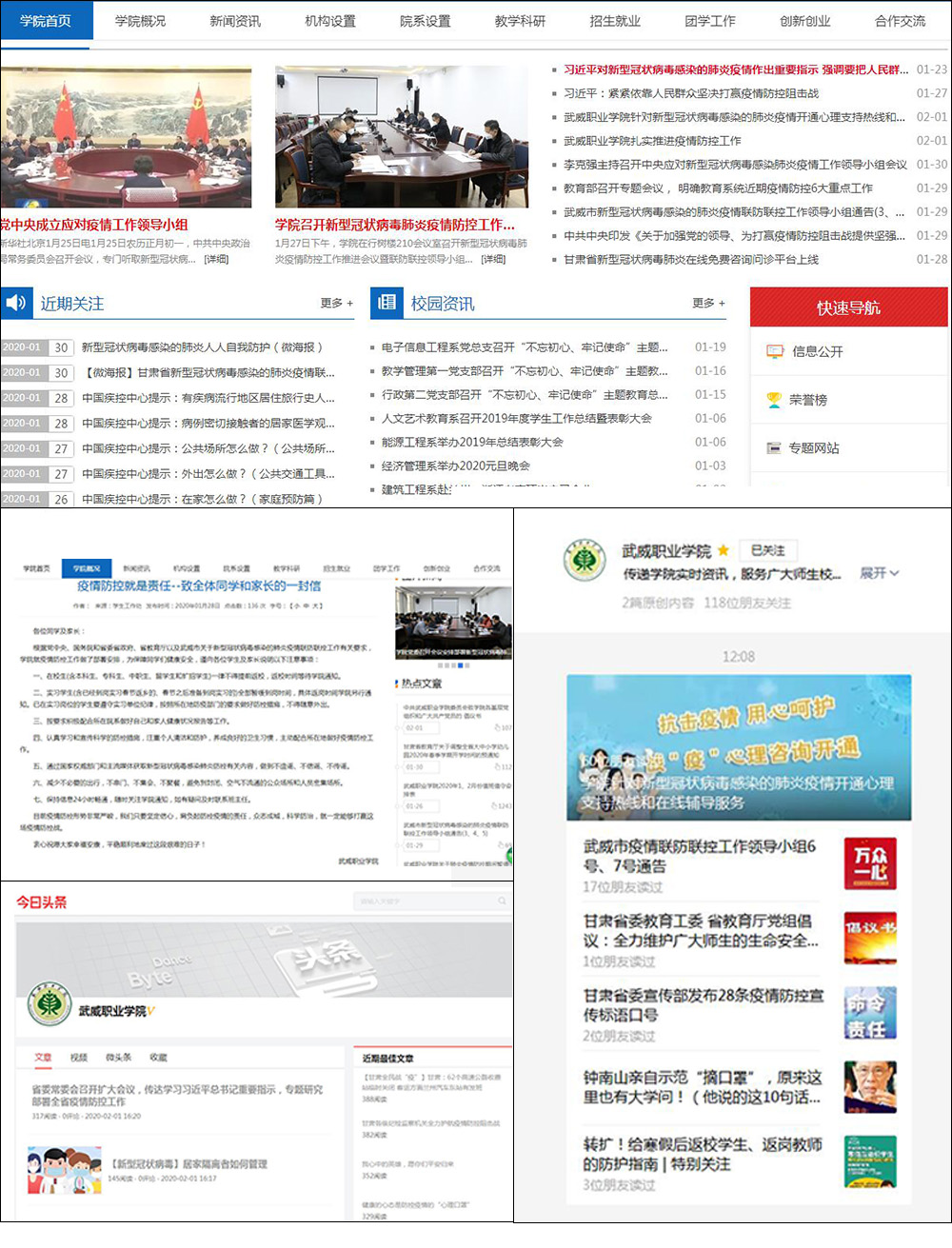 學(xué)院通過網(wǎng)站、微信公眾號、隴政釘、微信群、QQ群等平臺,第一時(shí)間刊載轉(zhuǎn)發(fā)習(xí)近平總書記重要指示、李克強(qiáng)總理批示,中共中央、教育部、省委、省教育工委、武威市委關(guān)于做好新型冠狀病毒感染肺炎疫情防控工作的重要會議、文件、通知以及《武威職業(yè)學(xué)院致全體同學(xué)和家長的一封信》《中共武威職業(yè)學(xué)院委員會致學(xué)院各基層黨組織和廣大共產(chǎn)黨員的倡議書》和防控知識50多條;做到宣傳教育和正面引導(dǎo)覆蓋到每一位教師、每一個(gè)班級、每一位學(xué)生,確保師生和學(xué)生家長及時(shí)了解疫情發(fā)展態(tài)勢、臨床癥狀和學(xué)習(xí)掌握防控知識;做到科學(xué)認(rèn)識、理性判斷、合理應(yīng)對,不信謠、不傳謠,養(yǎng)成健康的防控生活習(xí)慣,堅(jiān)定信心、眾志成城防控疫情、戰(zhàn)勝疫情。