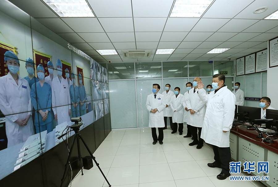 2月10日,中共中央總書記、國(guó)家主席、中央軍委主席習(xí)近平在北京調(diào)研指導(dǎo)新冠肺炎疫情防控工作。這是習(xí)近平來到首都醫(yī)科大學(xué)附屬北京地壇醫(yī)院門診樓一層運(yùn)行監(jiān)控中心,通過監(jiān)控畫面察看患者住院診療情況,并視頻連線正在病房值班的醫(yī)務(wù)人員。 新華社記者 鞠鵬 攝
