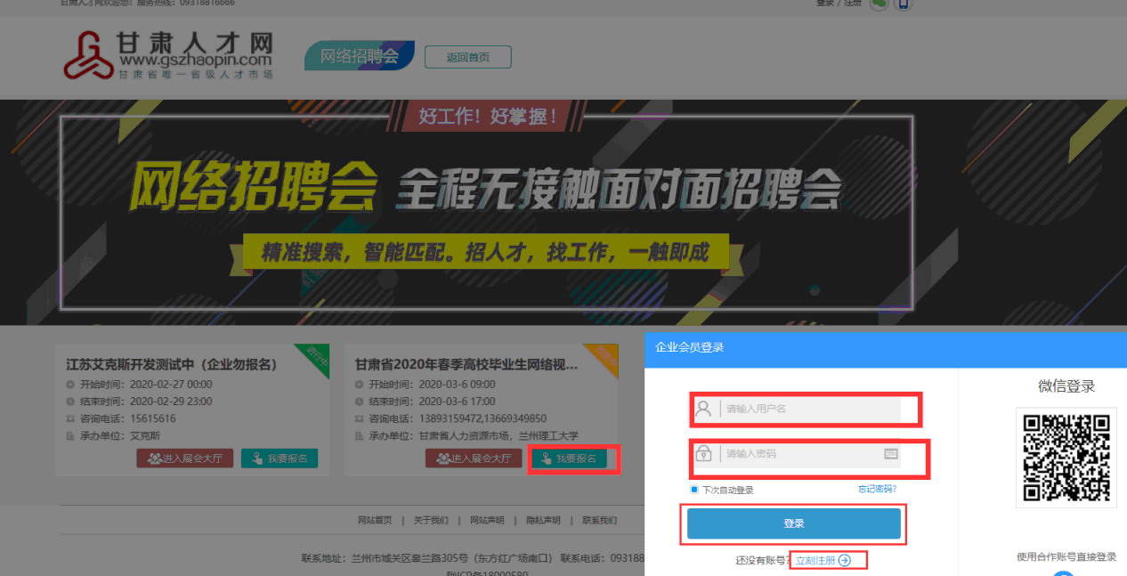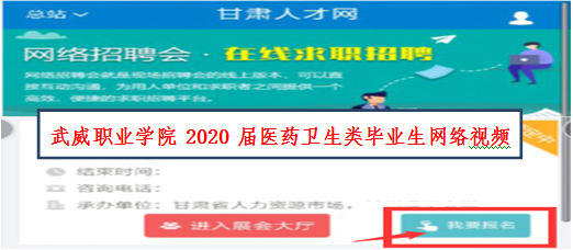 1.登錄甘肅人才網(wǎng)(www.gszhaopin.com),點擊菜單欄“招聘會”—“網(wǎng)絡(luò)招聘會”進入二級頁面菜單,進入網(wǎng)絡(luò)招聘會列表—選擇“武威職業(yè)學院2020屆醫(yī)藥衛(wèi)生類畢業(yè)生網(wǎng)絡(luò)視頻雙選會”點擊“我要報名”按鈕,登錄企業(yè)后臺(無賬號點擊“立即注冊”,資質(zhì)通過審核后再報名),待定審核。