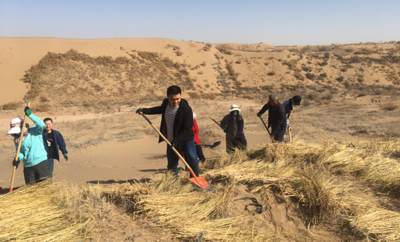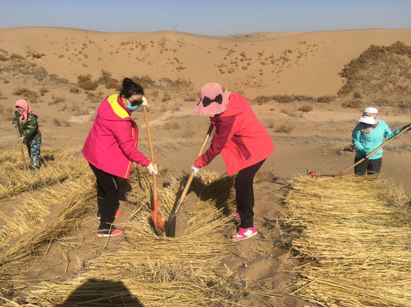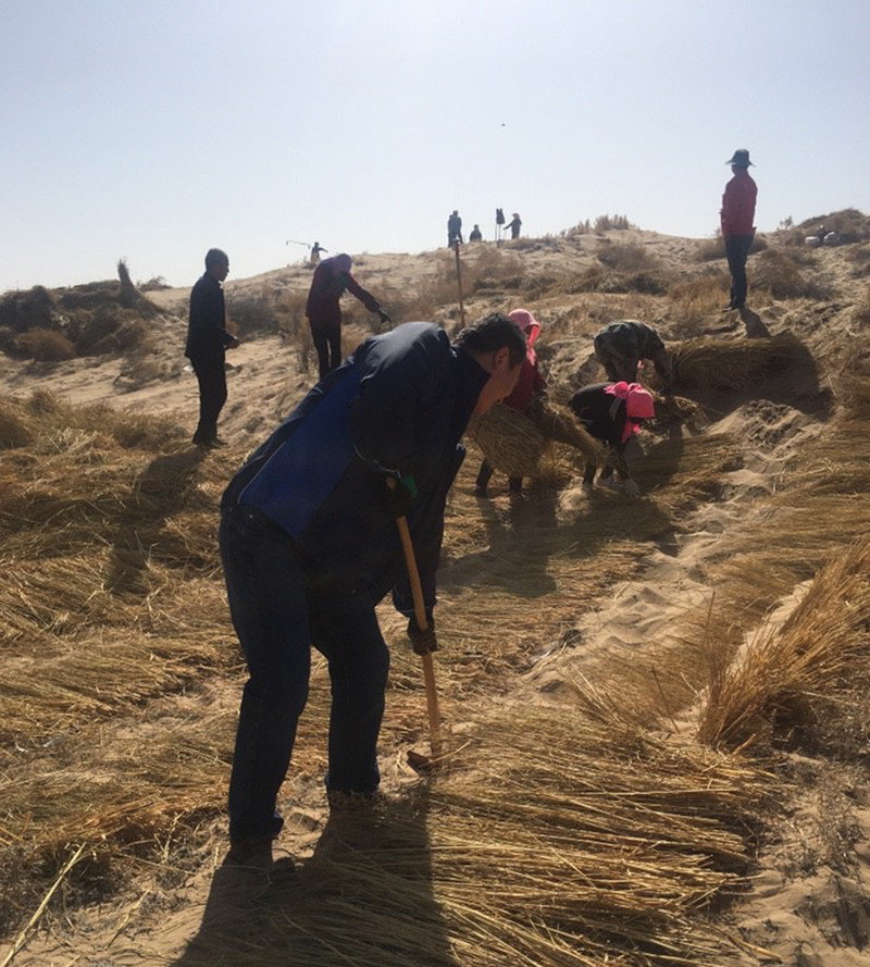 全體壓沙人員不怕吃苦、不怕流汗,爭先恐后投入壓沙勞動(dòng)中。分工合作,有的開溝,有的鋪草,有的壓沙,整齊的麥草方格由一排排向一片片不斷延伸,一個(gè)個(gè)沙丘逐漸被麥草網(wǎng)格牢牢鎖住。