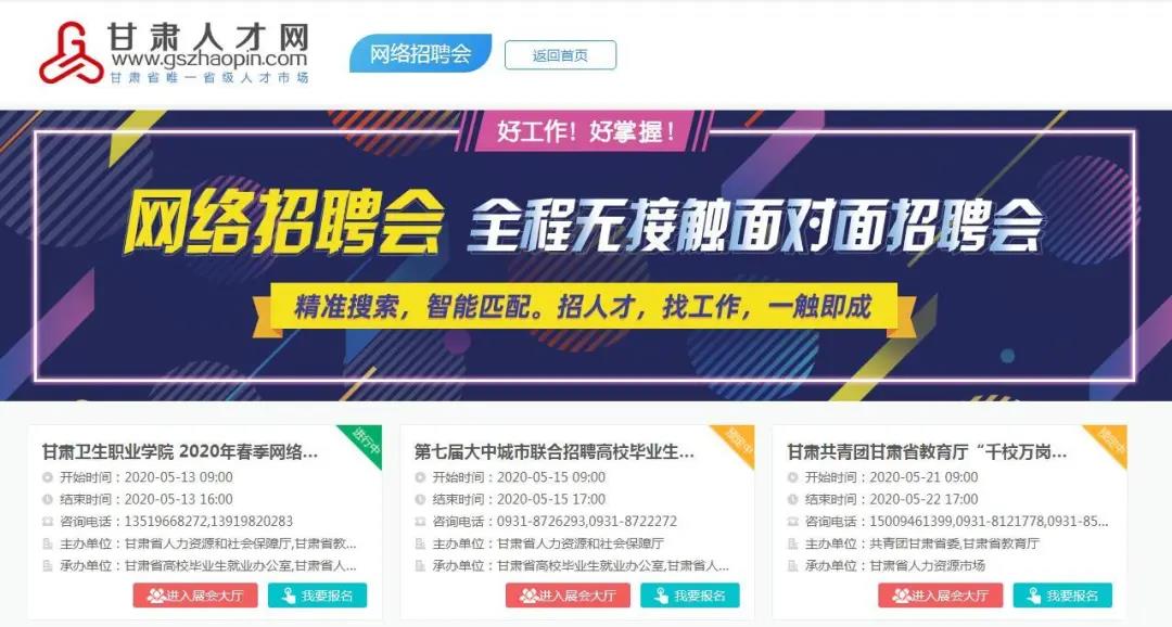 為應對新冠肺炎疫情沖擊,加大高校畢業(yè)生就業(yè)服務力度,進一步做好高校畢業(yè)生就業(yè)服務工作,甘肅省高校畢業(yè)生就業(yè)辦公室、甘肅省人力資源市場定于2020年5月15日聯(lián)合甘肅省內部分高校在甘肅人才網(www.gszhaopin.com)舉辦“第七屆大中城市聯(lián)合招聘高校畢業(yè)生春季網絡視頻專場招聘會‘甘肅站’”活動。