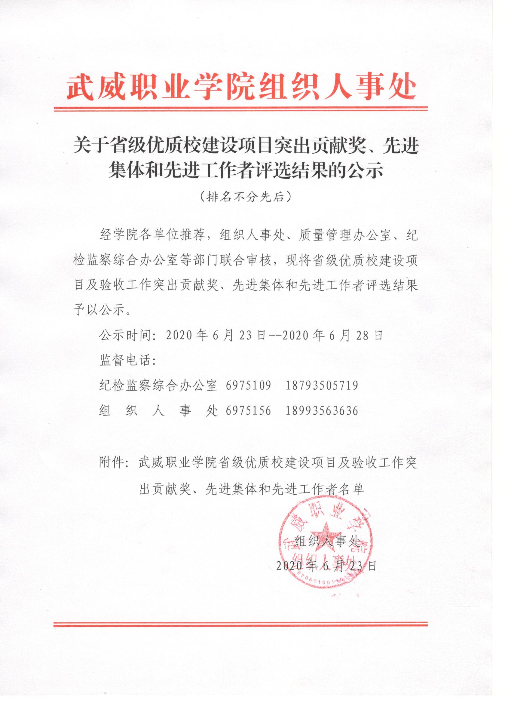 關于省級優(yōu)質校建設項目突出貢獻獎、先進集體和先進工作者評選結果的公示