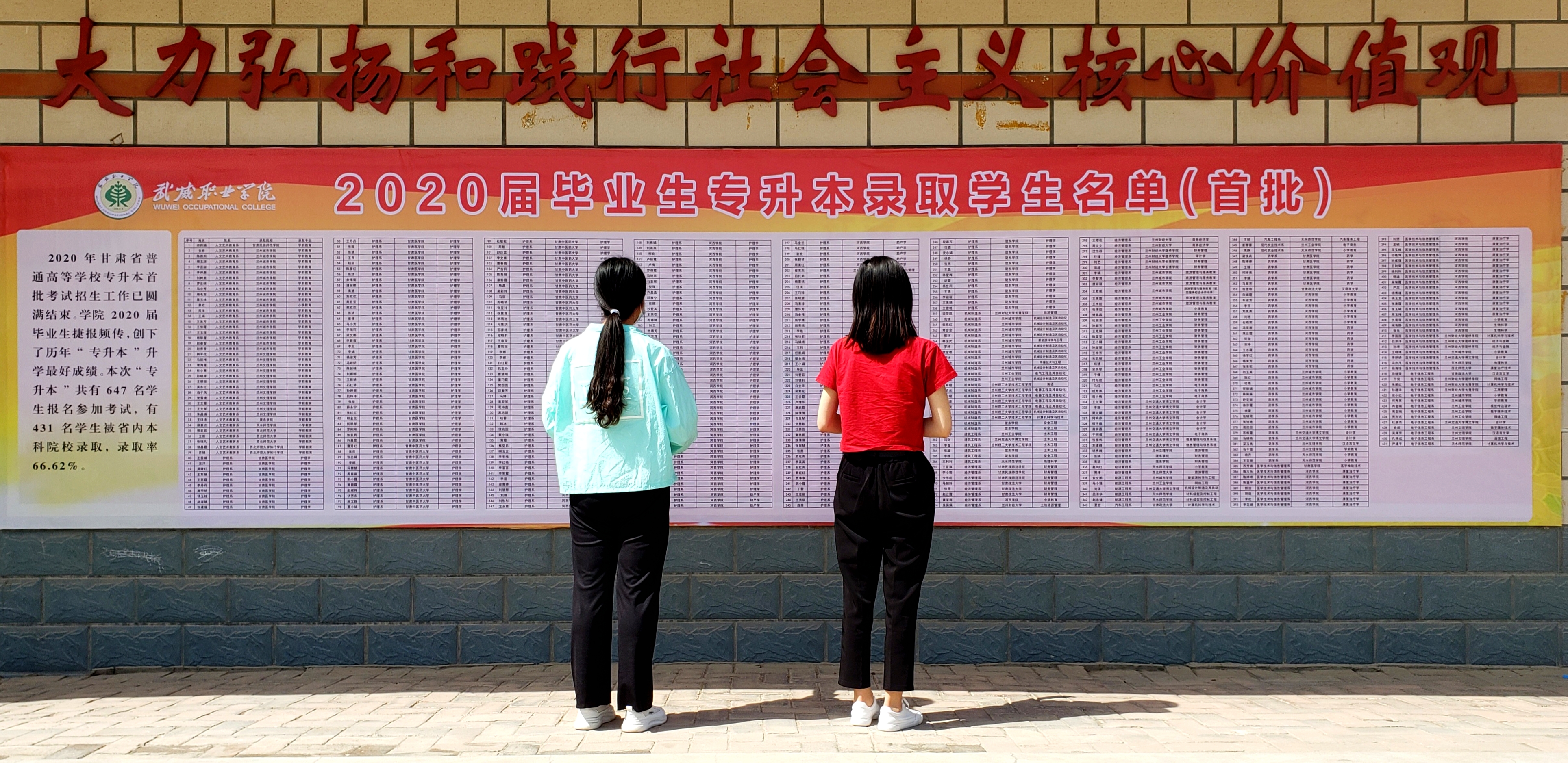 2020年甘肅省普通高等學(xué)校專(zhuān)升本首次考試招生工作已圓滿(mǎn)結(jié)束。學(xué)院2020屆畢業(yè)生捷報(bào)頻傳,創(chuàng)下了歷年“專(zhuān)升本”升學(xué)的最好成績(jī)。本次“專(zhuān)升本”共有647名學(xué)生報(bào)名參加考試,有431名學(xué)生被省內(nèi)本科院校錄取,錄取率為66.62%。