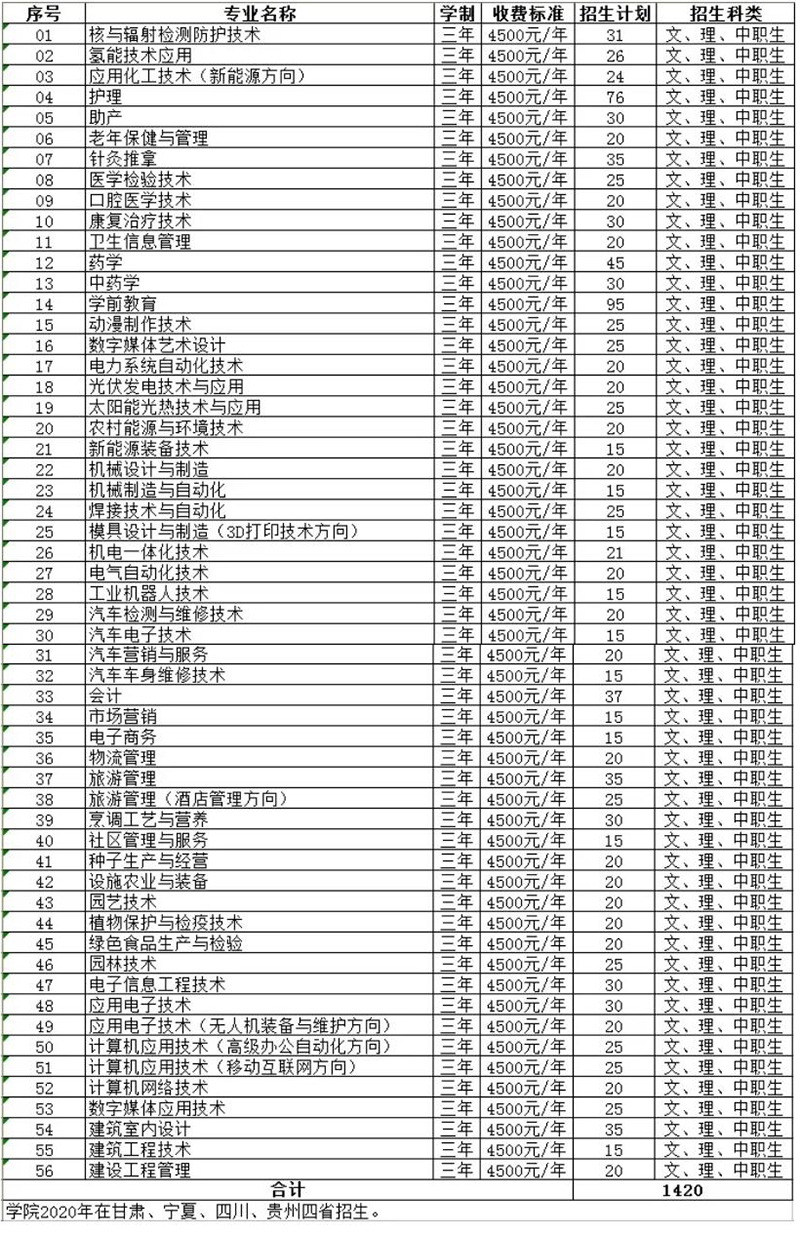 武威職業(yè)學(xué)院2020年普通高考及中職升學(xué)招生計劃
