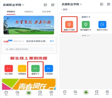 新生使用“智慧校園”賬號,登錄釘釘平臺,進入“武威職業(yè)學院”組織架構,點擊武職門戶進入新生線上報到流程。