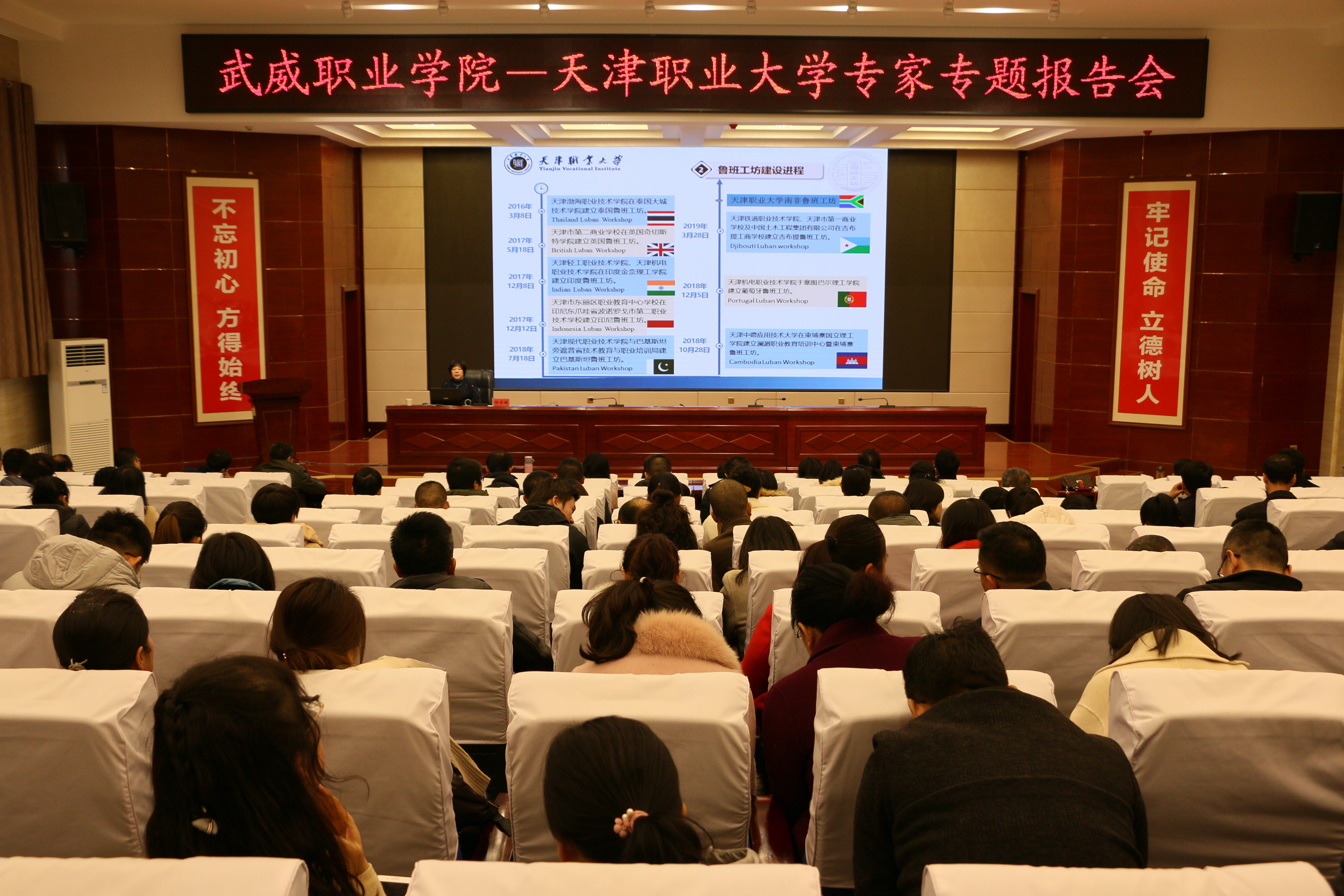 11月20日上午,武威職業(yè)學院“綠洲講壇”第28期在學院菁英廳舉行,本期活動邀請到天津職業(yè)大學校長楊榮敏作主題為“魯班工坊—中國職業(yè)教育國際知名品牌”的報告。學院領導班子、中層干部、教師代表220余人參加了報告會。本期講壇由學院黨委書記、院長趙明主持。