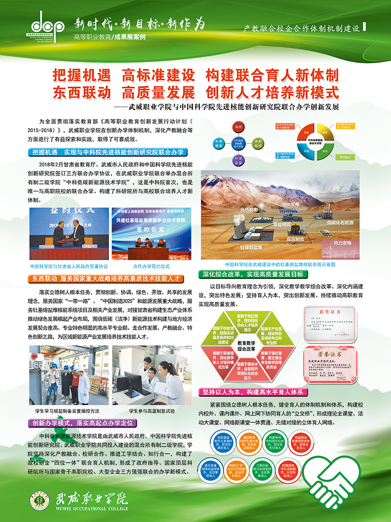 12月8日至9日,學(xué)院黨委書記、院長趙明教授、副院長翟存祥教授帶隊參加了在福建福州召開的全國高職高專校長聯(lián)席會議2018年年會。學(xué)院自主研發(fā)的“光伏組件智能清潔裝置”榮獲高職院校技術(shù)研發(fā)與應(yīng)用成果 “優(yōu)秀成果獎”(全國僅36所高職院校獲此殊榮,甘肅省僅2所),“學(xué)院與中科院先進核能創(chuàng)新研究院聯(lián)合辦學(xué)創(chuàng)新發(fā)展”案例入選教育成果案例展。