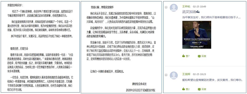 《中華優(yōu)秀傳統(tǒng)文化》課程團(tuán)隊(duì)的馮文娟老師在開(kāi)學(xué)第一天借助在線教學(xué)平臺(tái)向?qū)W生推送了《致2019級(jí)學(xué)生的一封信》,激勵(lì)學(xué)生要敬畏自然、珍愛(ài)生命,致敬英雄、感恩榜樣,寬闊心胸、厚植家國(guó)情懷。信中這樣寫(xiě)道:“在疫情防控中,我們無(wú)時(shí)無(wú)刻不在感受國(guó)家的力量,正因?yàn)橛羞@樣強(qiáng)大的力量,讓我們?cè)诶щy面前堅(jiān)守責(zé)任,無(wú)私奉獻(xiàn),眾志成城,充滿信心地迎接戰(zhàn)勝疫情的勝利曙光?!薄?家是最小國(guó),國(guó)是千萬(wàn)家。在這個(gè)沒(méi)有硝煙的戰(zhàn)場(chǎng),建造武漢火神山、雷神山醫(yī)院的中國(guó)速度,證明了我們擁有戰(zhàn)勝疫情的強(qiáng)大力量;捐資捐物,證明了我們有打贏疫情阻擊戰(zhàn)的中國(guó)精神;全國(guó)人民上下一心,自我隔離,更體現(xiàn)了我們共同戰(zhàn)勝困難的堅(jiān)定決心。春天已到,歷經(jīng)苦寒依舊傲然的梅花,定將帶著勝利的消息和沁人的花香一同到來(lái)?!蓖瑫r(shí),為學(xué)生推送由央視頻和有道精品課共同錄制的《面對(duì)疫情教你如何有效防范》疫情防控專題視頻,與學(xué)生一起為打贏新冠肺炎疫情防控阻擊戰(zhàn)貢獻(xiàn)力量。