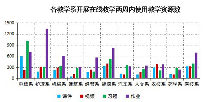 根據(jù)學(xué)院教學(xué)平臺(tái)管理數(shù)據(jù)和各教學(xué)系反饋數(shù)據(jù),開(kāi)課兩周內(nèi)全院開(kāi)展在線教學(xué)教師共有263人,開(kāi)設(shè)課程284門;學(xué)院兩周內(nèi)授課課時(shí)總數(shù)達(dá)到1949學(xué)時(shí),教師開(kāi)展在線教學(xué)3334人次;發(fā)布作業(yè)共計(jì)1306次,組織答疑討論1918次。教師教學(xué)形式靈活多樣,對(duì)教學(xué)平臺(tái)及教學(xué)工具的熟練程度逐漸提升,教師討論交流的主題從基礎(chǔ)性的上傳資源、組織教學(xué)、組織教學(xué)等轉(zhuǎn)變?yōu)樽鳂I(yè)發(fā)布、主題討論、學(xué)情數(shù)據(jù)分析,在線教學(xué)工作步入正軌。