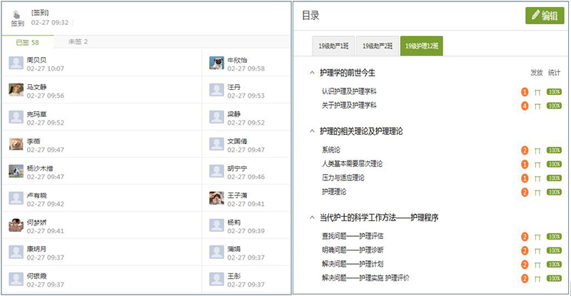 根據(jù)教學(xué)實(shí)際,護(hù)理制定了線上教學(xué)工作方案,對(duì)線上教學(xué)工作做出統(tǒng)一安排,強(qiáng)調(diào)了線上教學(xué)督導(dǎo)、任課教師和班主任的具體工作職責(zé)。2月24日,各項(xiàng)教學(xué)工作有序開(kāi)展。共24名教師完成 11門課程的在線教學(xué)任務(wù),主要依托學(xué)院在線教學(xué)平臺(tái)、中國(guó)大學(xué)MOOC、人衛(wèi)慕課、智慧職教平臺(tái)上完成授課,上課學(xué)生1510人。通過(guò)多層次多方位的監(jiān)控?cái)?shù)據(jù)分析,全系在線教學(xué)整體運(yùn)行平穩(wěn)有序,管理人員組織管理到位,教師盡職盡責(zé),課堂授課方式靈活多樣,學(xué)生積極互動(dòng),在線教學(xué)課堂效果良好,達(dá)到預(yù)期。學(xué)生平均到課率達(dá)到99%以上,積極落實(shí)了在線教學(xué)對(duì)學(xué)生“全覆蓋”的要求。教師在教學(xué)平臺(tái)上完成視頻、電子教材、PPT等資源上傳,積極開(kāi)展課前預(yù)習(xí)、主題討論、隨堂測(cè)驗(yàn)、作業(yè)布置等各類線上課堂教學(xué)活動(dòng),充分調(diào)動(dòng)學(xué)生的學(xué)習(xí)主動(dòng)性,學(xué)習(xí)效果良好。