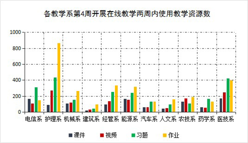 各教學(xué)系全面落實以學(xué)生為中心的教學(xué)理念,充分發(fā)揮班主任、任課教師、學(xué)生干部的監(jiān)督作用,提高在線教學(xué)成效。從各教學(xué)系整體統(tǒng)計數(shù)據(jù)看,第4周,教學(xué)資源學(xué)生訪問量達到了926633人次,學(xué)生到課127211人次,完成課后作業(yè)638次,上交學(xué)生40512人次。各門課程學(xué)習(xí)任務(wù)完成率普遍有所提高,大多數(shù)課程按照教學(xué)計劃進度學(xué)生學(xué)習(xí)完成率已全部達到100%。