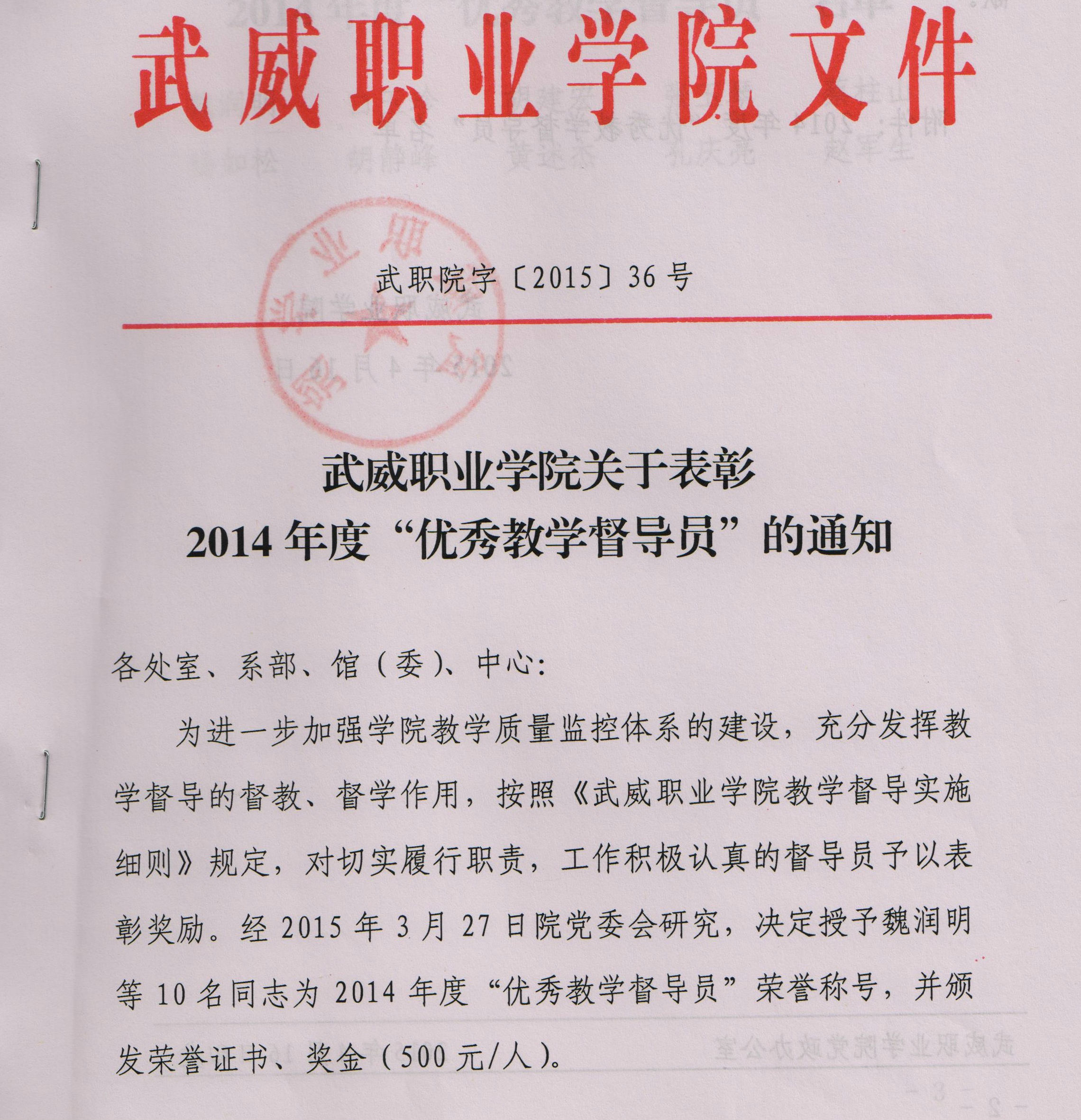 關(guān)于表彰2014年度“優(yōu)秀教學(xué)督導(dǎo)員”的決定