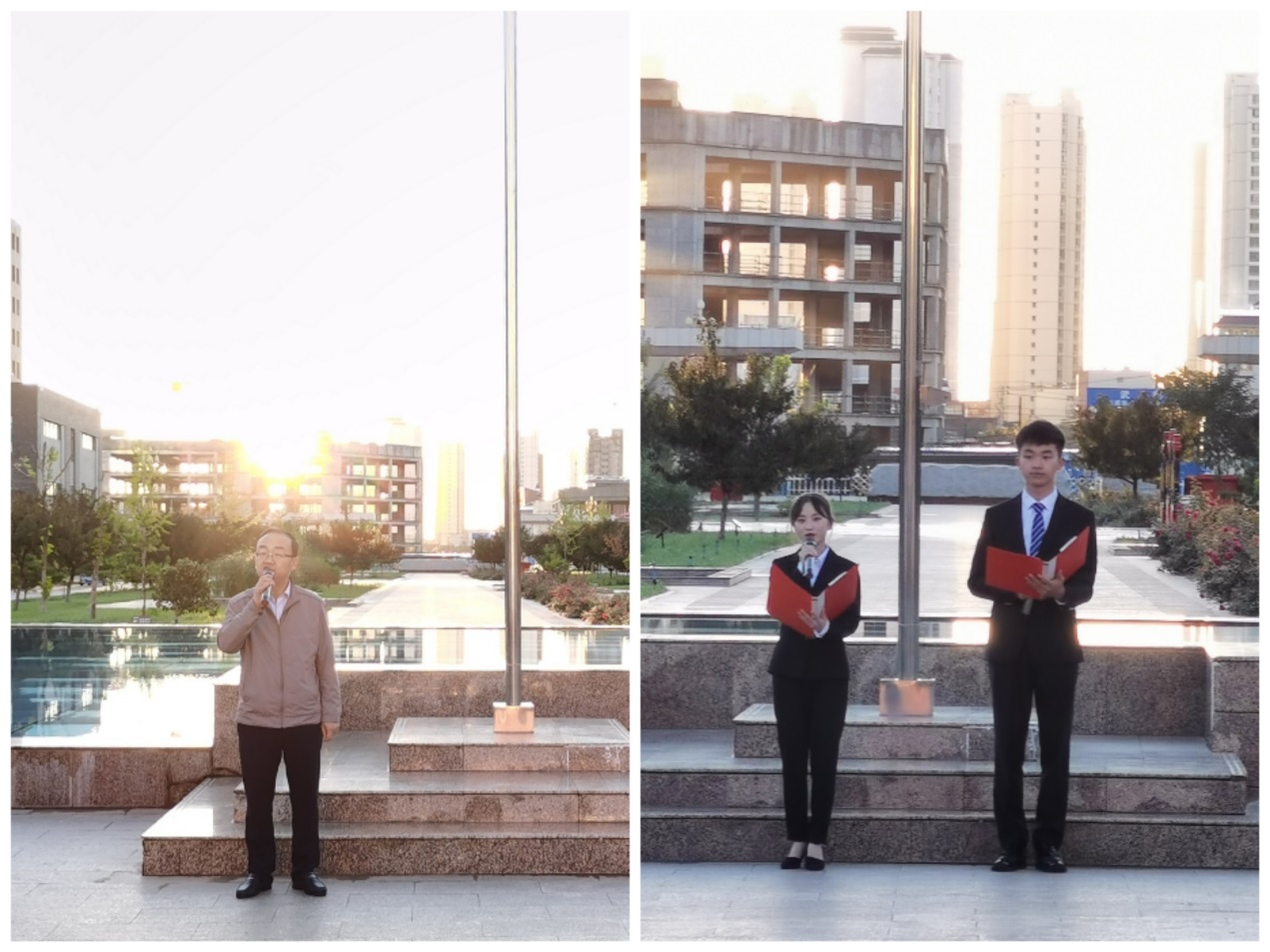 升旗儀式開(kāi)始,全體肅立,在師生的注視中,國(guó)旗護(hù)衛(wèi)隊(duì)員,迎著朝陽(yáng),邁著鏗鏘有力的步伐來(lái)到國(guó)旗臺(tái)下,伴隨著莊嚴(yán)的《中華人民共和國(guó)國(guó)歌》,鮮艷的五星紅旗冉冉升起。升旗儀式結(jié)束后,2020級(jí)學(xué)生代表?xiàng)顣赠i、張鈺鈺進(jìn)行了國(guó)旗下演講,他們呼吁同學(xué)們?cè)谇髮W(xué)路上,不斷探索、樂(lè)學(xué)善思、德技并修、求知上進(jìn)、勤奮好學(xué),做一名洋溢青春活力、釋放青春激情、追逐青春夢(mèng)想、健康向上的新時(shí)代大學(xué)生,發(fā)出“請(qǐng)黨放心、強(qiáng)國(guó)有我”的深情告白。