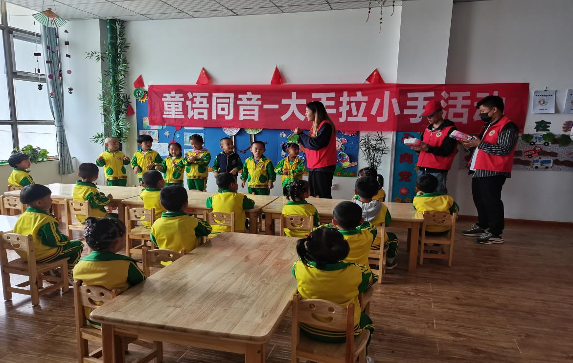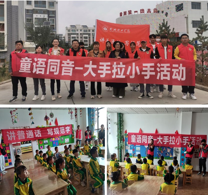 為認(rèn)真貫徹落實(shí)《教育部等九部門關(guān)于開展第24屆全國推廣普通話宣傳周活動的通知》(教語用函〔2021〕1號)、《甘肅省語言文字工作委員會等九部門關(guān)于開展第24屆全國推廣普通話宣傳周活動的通知》要求,進(jìn)一步加大國家通用語言文字推廣力度,9月14日,學(xué)院推普志愿隊師生在古浪綠洲小鎮(zhèn)第一幼兒園開展童語同音-大手拉小手推普活動,推普志愿隊詳細(xì)了解小鎮(zhèn)幼兒教師及兒童的普通話普及情況,并與大、中班幼兒進(jìn)行了有趣的互動活動。