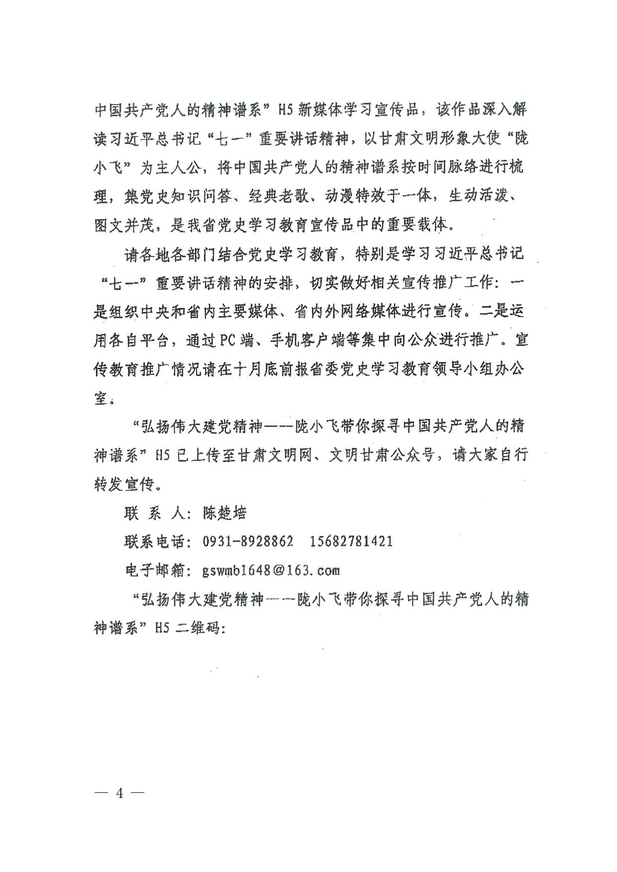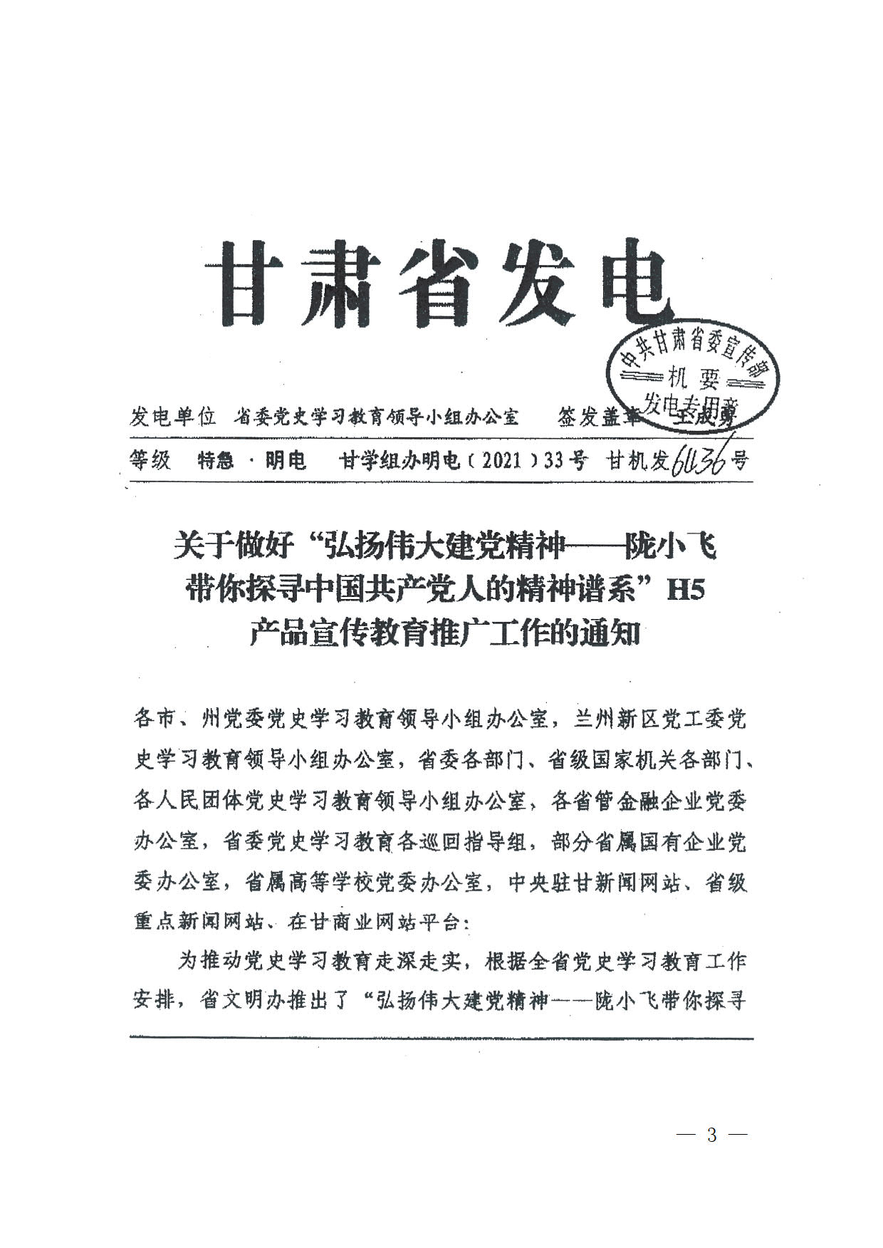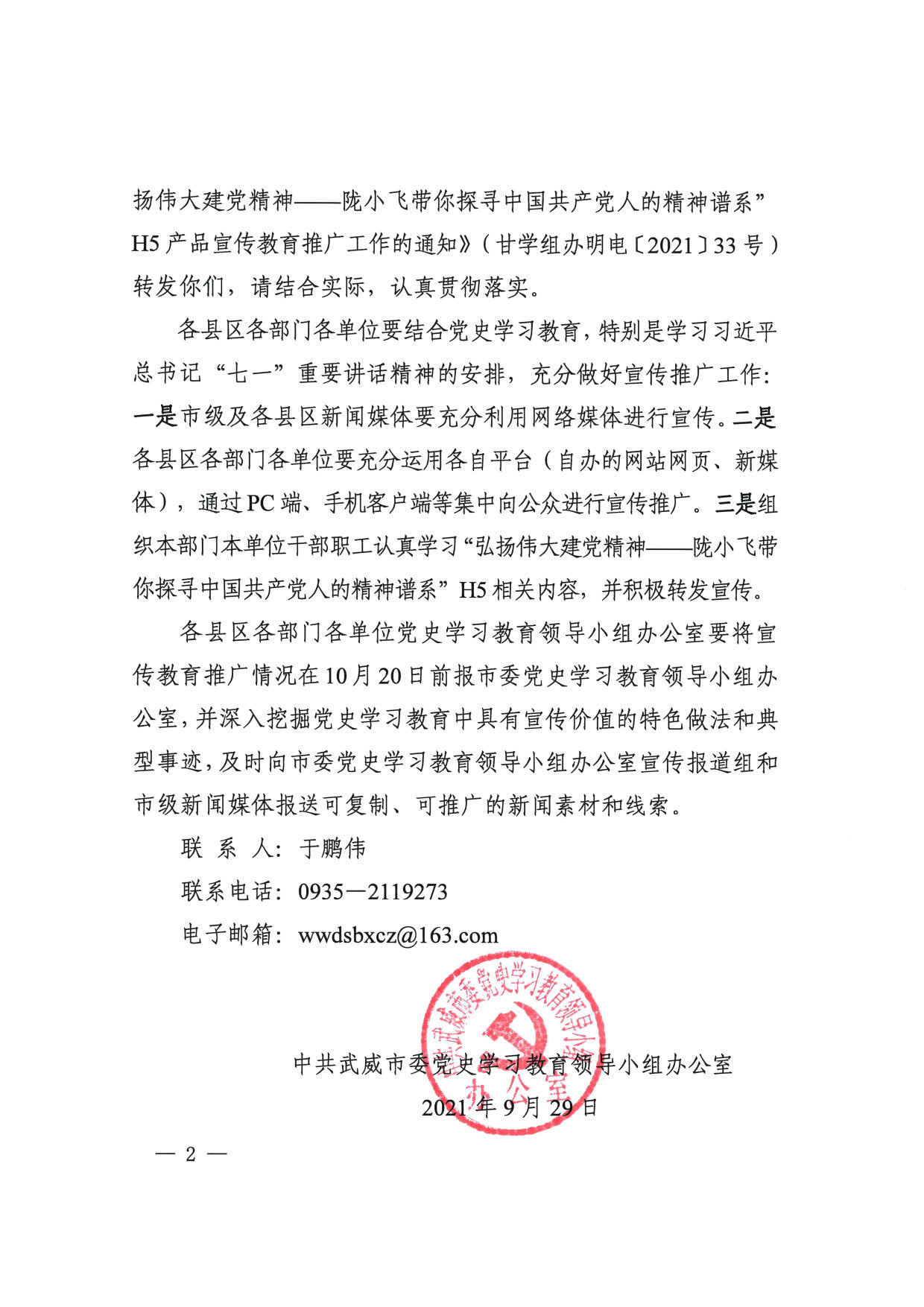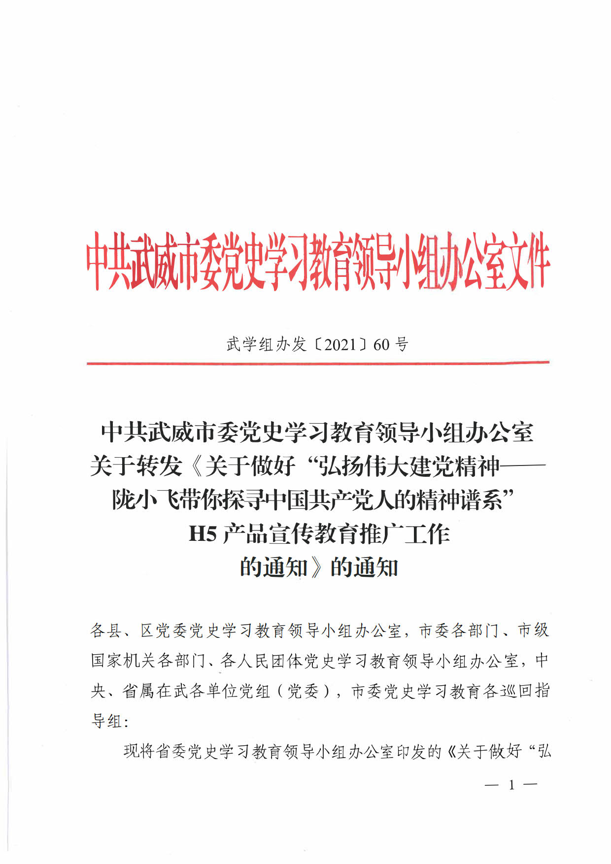 中共武威市委黨史學習教育領導小組辦公室關于轉發(fā)〈關于做好 “弘揚偉大建黨精神——隴小飛帶你探尋中國共產(chǎn)黨人的精神譜系”H5產(chǎn)品宣傳教育推廣工作的通知〉的通知