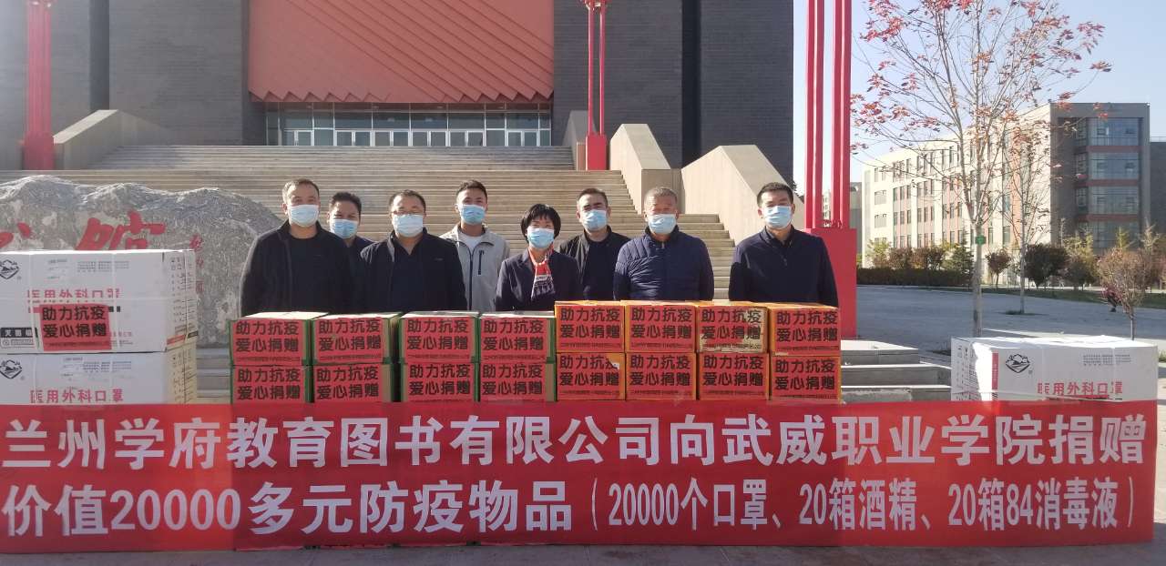 2021年11月4日,武威職業(yè)學(xué)院收到蘭州學(xué)府教育圖書有限公司捐贈的價(jià)值20000多元防疫物品(20000個(gè)口罩、20箱酒精、20箱84消毒液)。學(xué)院黨委委員、副院長何毅對蘭州學(xué)府教育圖書有限公司的慷慨贈送表示感謝,對他們在危難面前勇于擔(dān)當(dāng)、鼎力相助的善舉表示贊揚(yáng)。她說,目前學(xué)校疫情防控在即,消護(hù)物品儲備處于緊張狀態(tài),蘭州學(xué)府教育圖書有限公司雪中送炭、奉獻(xiàn)愛心,增強(qiáng)了我們打贏這場疫情防控阻擊戰(zhàn)的信心。
