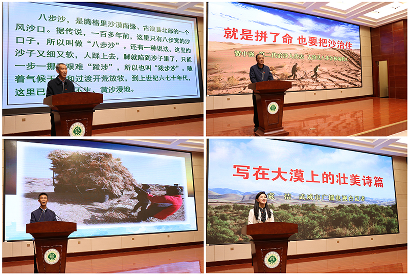 報告會上,二代治沙人代表、八步沙林場場長郭萬剛,二代治沙人代表、八步沙林場職工賀中強(qiáng),三代治沙人、八步沙林場管護(hù)員郭璽、武威市廣播電視臺記者袁潔,分別從綠色承諾、使命責(zé)任、接續(xù)奮斗、記者見證等不同角度、不同側(cè)面,生動再現(xiàn)了“六老漢”三代人治沙造林持續(xù)改善生態(tài)環(huán)境、讓沙漠披綠生金的感人事跡。在場師生無不為“六老漢”三代人的感人事跡深深震撼,紛紛表示要學(xué)習(xí)和繼承“六老漢”三代人困難面前不低頭、敢把沙漠變綠洲的奮斗精神,為建設(shè)美麗中國、實(shí)現(xiàn)中華民族永續(xù)發(fā)展貢獻(xiàn)自己的青春力量。