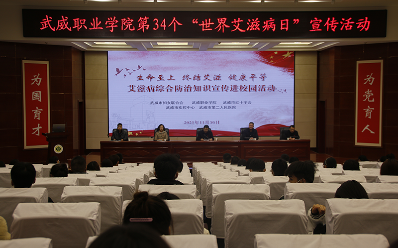 11月30日,學(xué)院在菁英廳開展了“生命至上 終結(jié)艾滋 健康平等”艾滋病綜合防治知識(shí)宣傳進(jìn)校園活動(dòng)。市疾控中心工會(huì)主席張富國(guó)、市婦聯(lián)副主席張惠華、學(xué)院黨委委員、副院長(zhǎng)王守云,市第二人民醫(yī)院院長(zhǎng)滕亮出席活動(dòng),活動(dòng)由學(xué)院護(hù)理系黨總支書記張建輝主持,市紅十字會(huì)、市疾控中心、天馬行市民云數(shù)據(jù)有限公司工作人員及武威職業(yè)學(xué)院師生代表參加活動(dòng)。