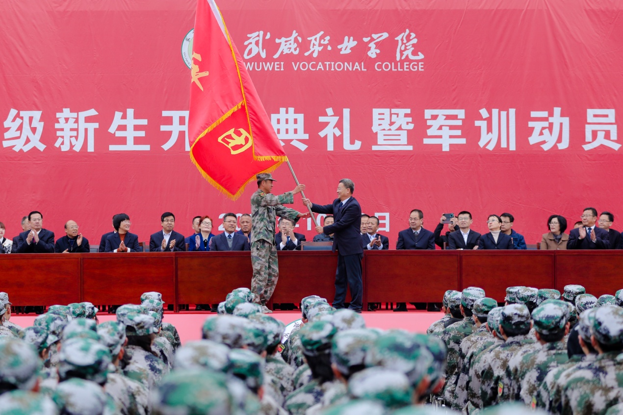 最后,趙明代表學(xué)院向軍訓(xùn)團授旗,并宣布2021年新生軍訓(xùn)開始。