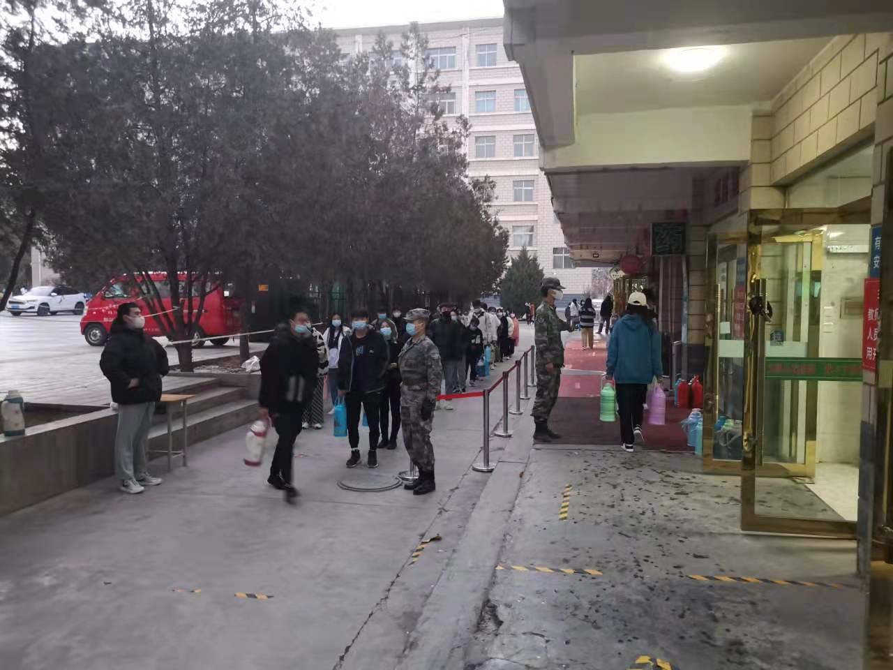 “同學(xué)們排隊時保持一米間距,不要聚集”“同學(xué)們上臺階的時候慢點走,注意腳下”,在堅定而溫暖的提示下,同學(xué)們整整齊齊的排好了隊等待打開水。他就是藥學(xué)系2019級藥學(xué)3班學(xué)生,原武警北京總隊執(zhí)勤某支隊退伍士兵常路楊同學(xué),本次疫情爆發(fā)后,他帶領(lǐng)學(xué)校10名退伍同學(xué)呈遞《請戰(zhàn)書》,主動請纓“抗疫”,參與到疫情防控工作中去,維護水房秩序、動員同學(xué)們戴好口罩、有序排隊。進入11月份以后,天氣越發(fā)的寒冷,但他們卻一如既往堅守著自己的崗位,持續(xù)奉獻著自己的光和熱,“寒風(fēng)裂征衣,飛雪裹戰(zhàn)袍”,他們用實際行動證明了中國軍人從來都不會后退。