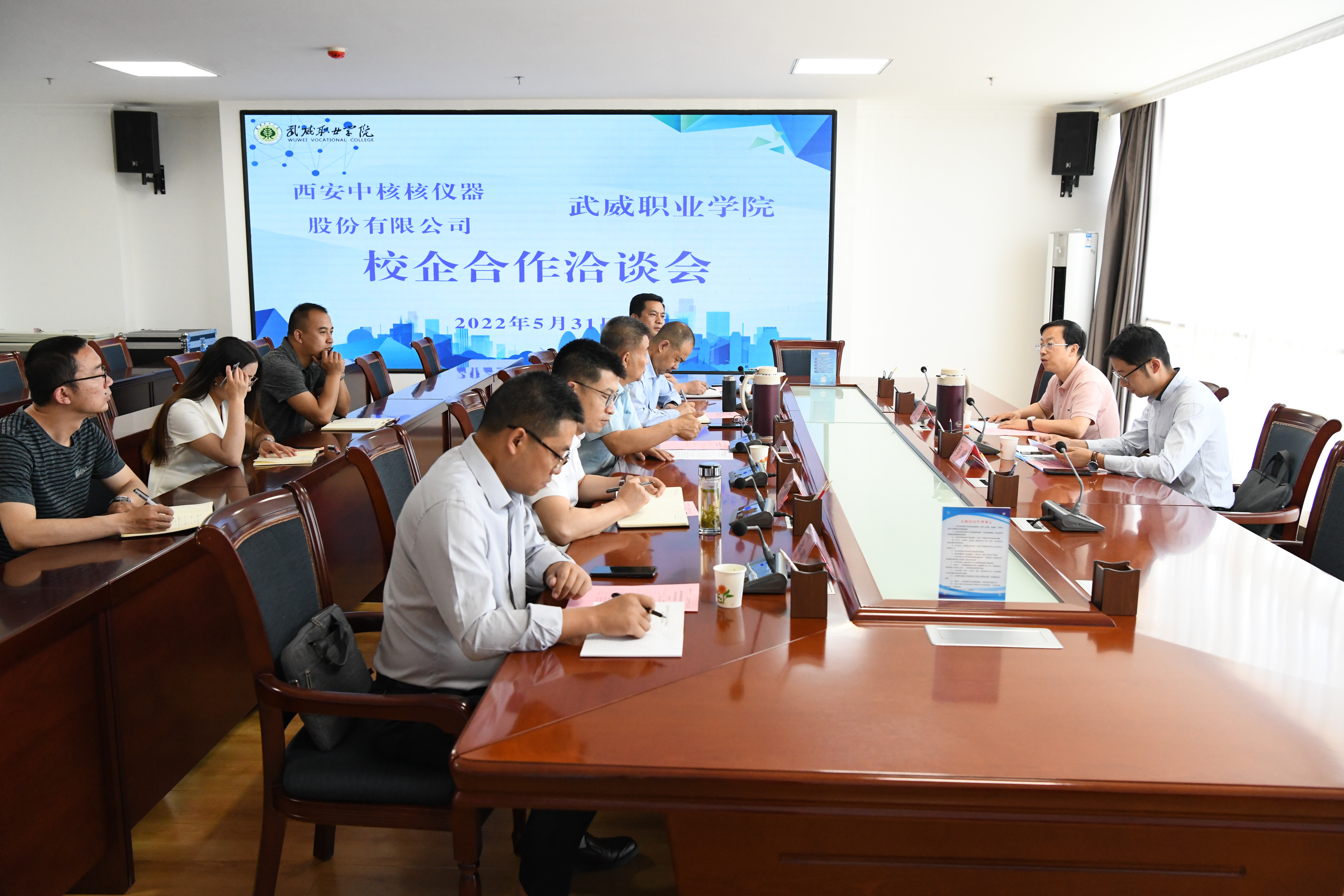 5月31日上午,西安中核核儀器股份有限公司儀器公司黨支部書記羅曦、同位素儀器公司主管索飛受邀到學(xué)??疾煺{(diào)研并洽談校企合作。學(xué)校黨委書記、校長(zhǎng)趙明,黨委副書記翟存祥、招生就業(yè)處副處長(zhǎng)董鵬、中科低碳新能源技術(shù)學(xué)院黨總支書記胡建宏、副院長(zhǎng)黃述杰、部分專業(yè)課教師參與洽談。