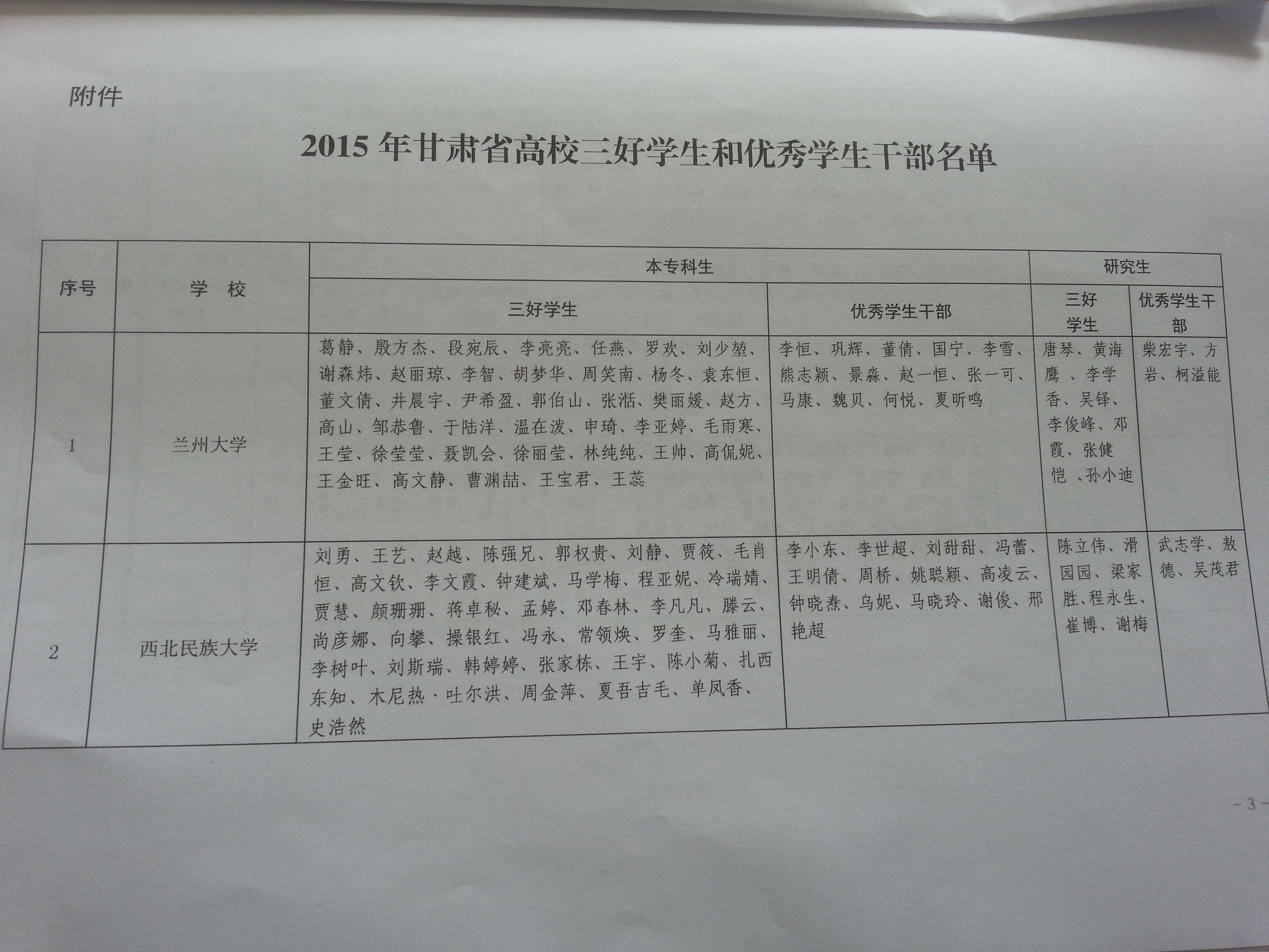 甘肅省教育廳關(guān)于表彰2015年甘肅省高?!叭脤W(xué)生”和“優(yōu)秀學(xué)生干部”的決定