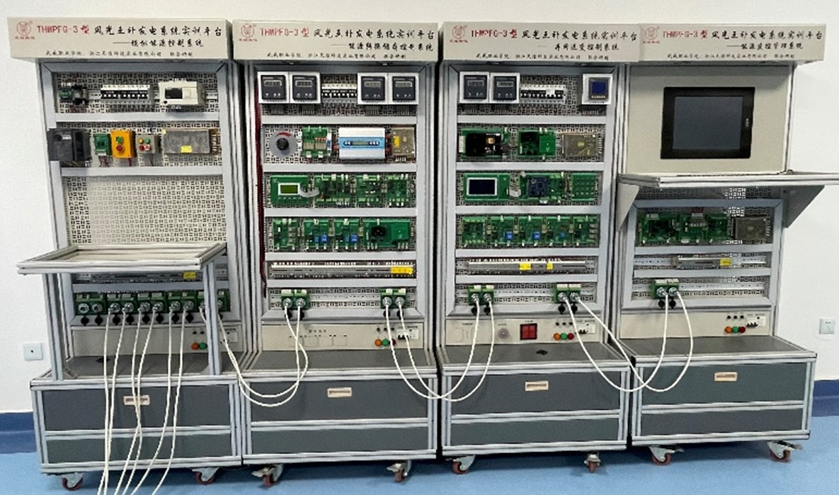 本實(shí)訓(xùn)室擁有風(fēng)光互補(bǔ)發(fā)電實(shí)訓(xùn)系統(tǒng)1套,其主要由光伏供電裝置、光伏供電系統(tǒng)、風(fēng)力供電裝置、風(fēng)力供電系統(tǒng)、模擬能源控制系統(tǒng)、能源轉(zhuǎn)換儲(chǔ)存控制系統(tǒng)、并網(wǎng)逆變控制系統(tǒng)、能源監(jiān)控管理系統(tǒng)組成,各裝置和系統(tǒng)具有獨(dú)立的功能,可以組合成光伏發(fā)電實(shí)訓(xùn)系統(tǒng)、風(fēng)力發(fā)電實(shí)訓(xùn)系統(tǒng)。本實(shí)訓(xùn)室主要服務(wù)于光伏工程技術(shù)及相近專業(yè)開設(shè)的光伏發(fā)電技術(shù)分析與應(yīng)用、光伏材料的加工與檢測(cè)、光伏電池的生產(chǎn)加工與維護(hù)、光伏控制器拆裝與維修、光伏器件的組裝與維護(hù)等課程。