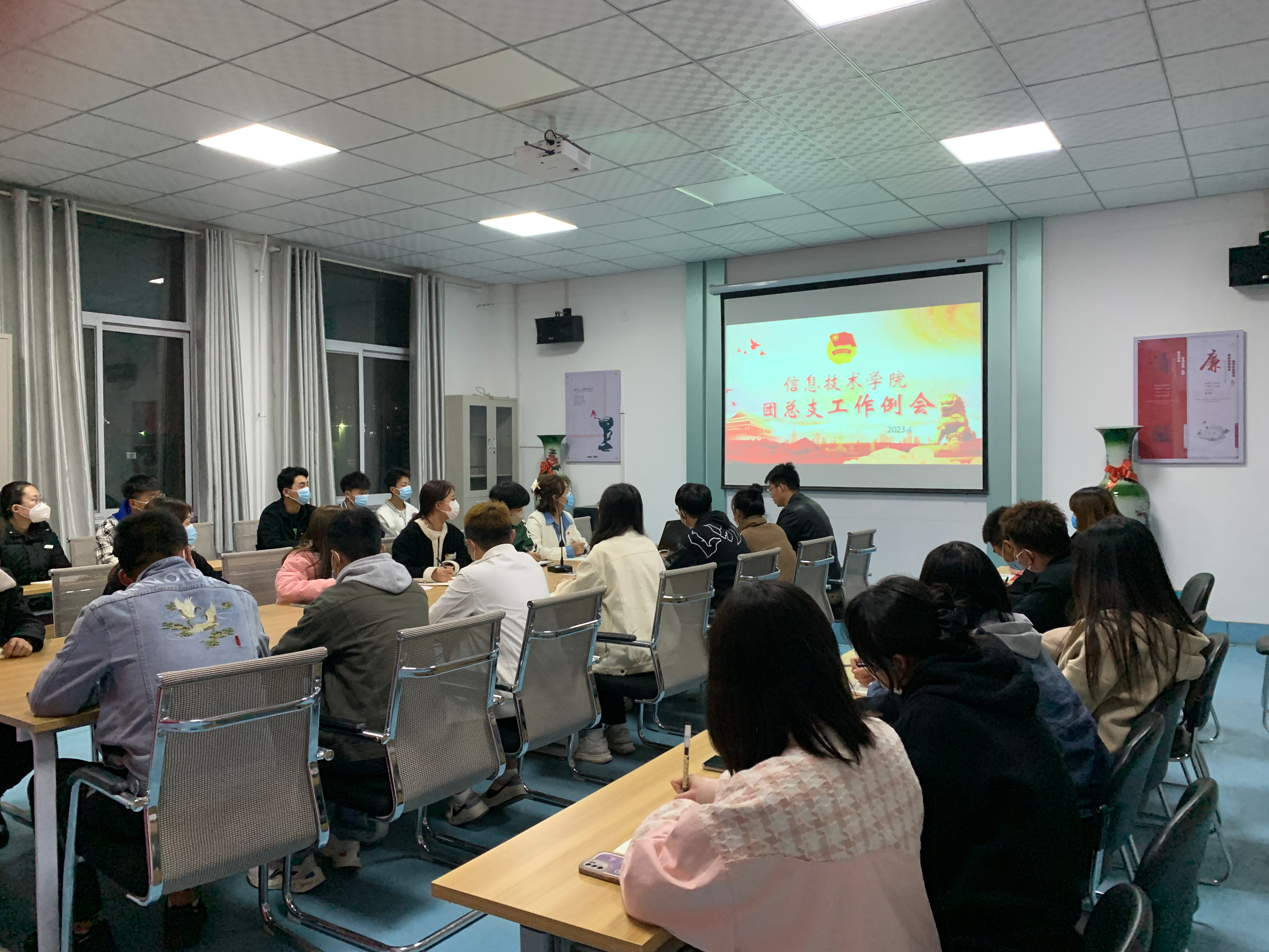 2023年4月9日晚自習(xí),信息技術(shù)學(xué)院團委工作會議在明德樓409會議室召開。校團委全體干部、各班團支部書記參加了會議。會議由書記李京靜主持。