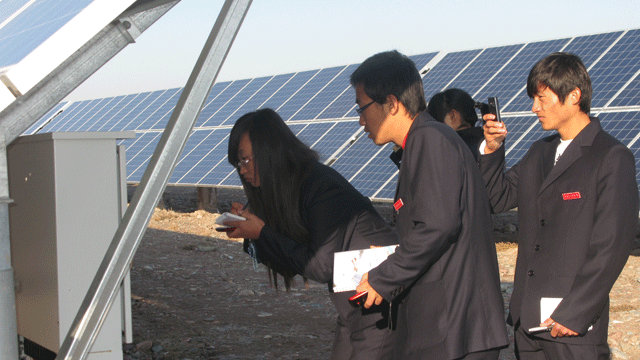 在觀摩學(xué)習(xí)過程中,全體師生受到了園區(qū)管委會工作人員的熱情接待,管委會張國偉主任帶領(lǐng)師生參觀了中節(jié)能甘肅武威太陽能發(fā)電有限公司,公司負(fù)責(zé)人向大家介紹了園區(qū)建設(shè)情況,從多晶硅、單晶硅的提煉、太陽能電池板的生產(chǎn)制造到光伏電站的建設(shè),對光伏發(fā)電產(chǎn)業(yè)鏈進行了較詳盡的講述。同學(xué)們看到園區(qū)內(nèi)一排排整齊擺置的太陽能電池板方陣時,都流露出激動崇敬的神情,一個個邊走邊看,并伸手觸摸太陽能電池板。同學(xué)們就光伏發(fā)電的原理、電池使用壽命、光電轉(zhuǎn)換效率以及光伏電站的運行維護等方面的專業(yè)知識向負(fù)責(zé)人請教,面對大家的疑問,園區(qū)負(fù)責(zé)人都耐心細(xì)致的做了解答。