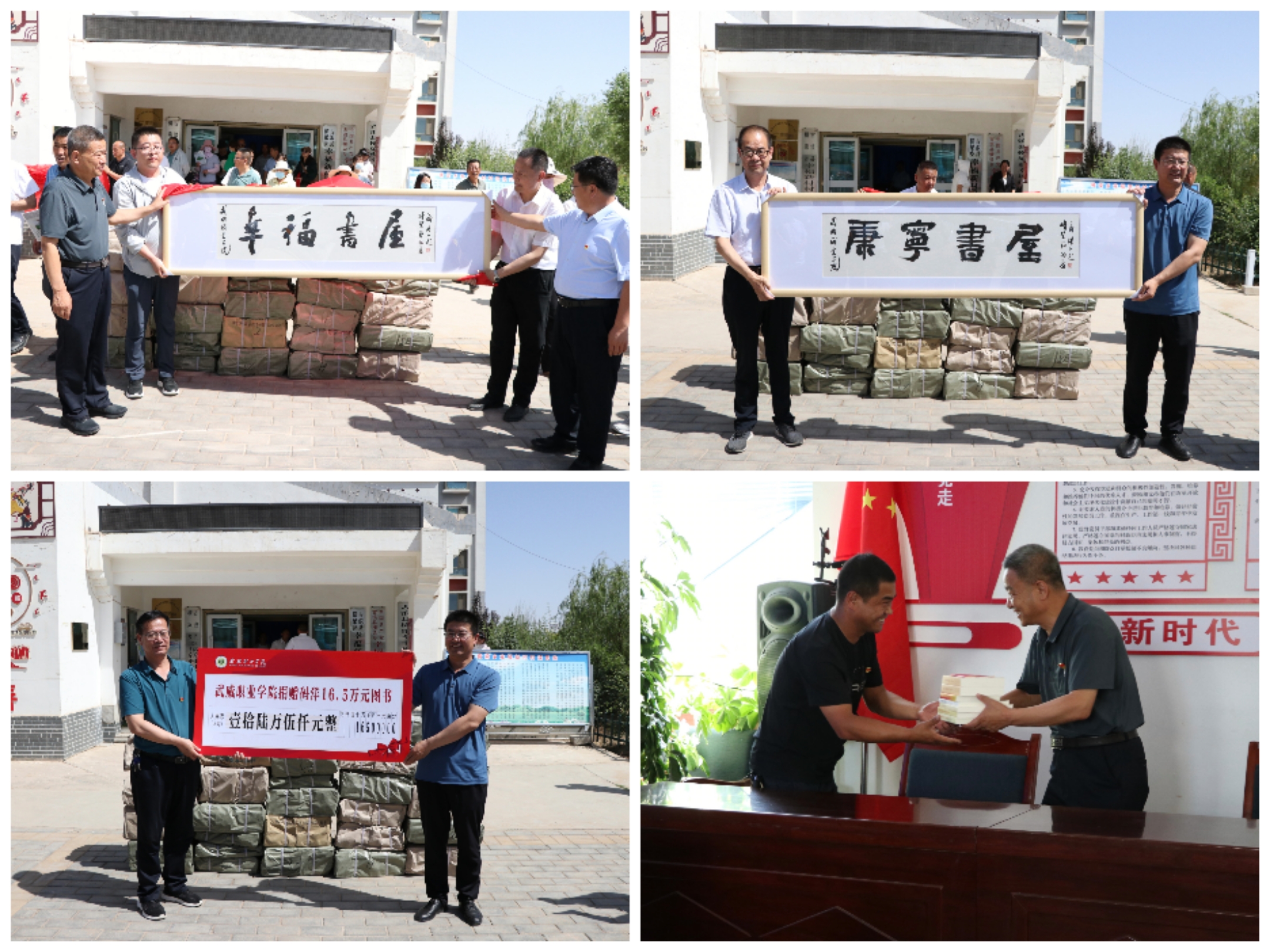 趙明、何文國就文化振興項(xiàng)目進(jìn)行了深入交流,簽訂了《定向幫扶捐贈協(xié)議》《武威職業(yè)學(xué)院在橫梁鄉(xiāng)幸福新村、康寧新村捐建開放式農(nóng)家書屋的協(xié)議書》,雙方代表為幸福書屋、康寧書屋揭牌,學(xué)校為橫梁鄉(xiāng)捐贈文化振興專項(xiàng)資金13萬元和碼洋16.5萬元的圖書。