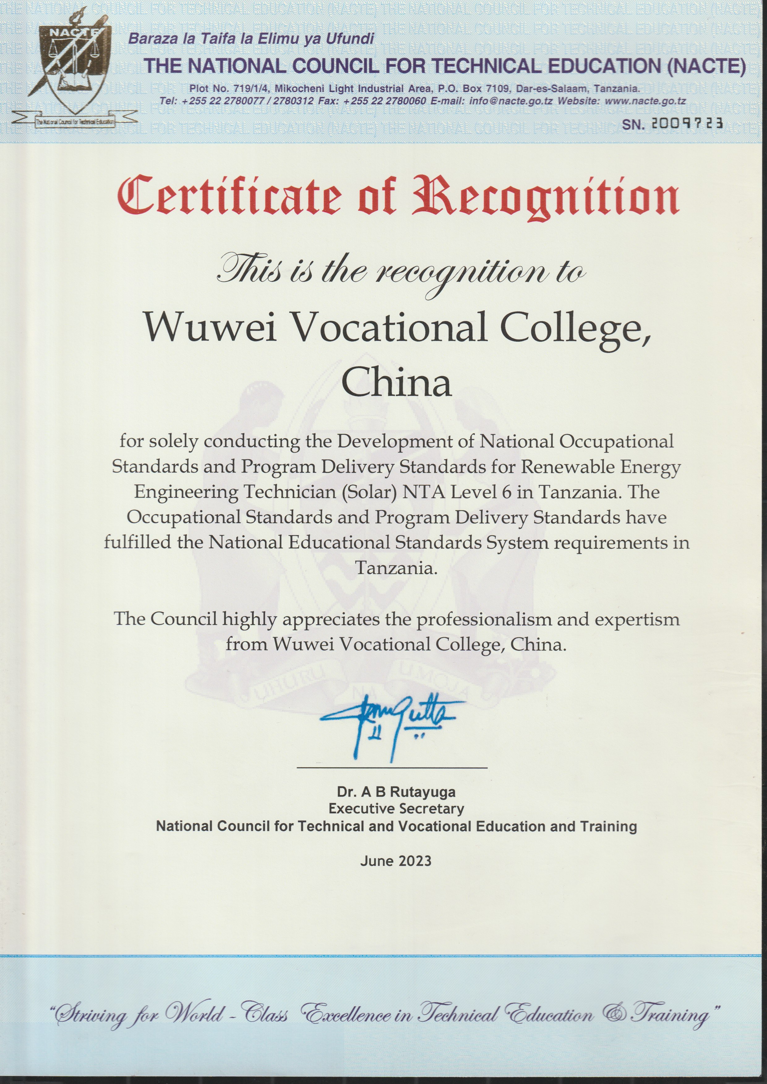 新能源工程技術(shù)員(太陽能)6級職業(yè)標準和配套專業(yè)教學標準通過坦桑尼亞國家職業(yè)教育委員會審核獲得認證