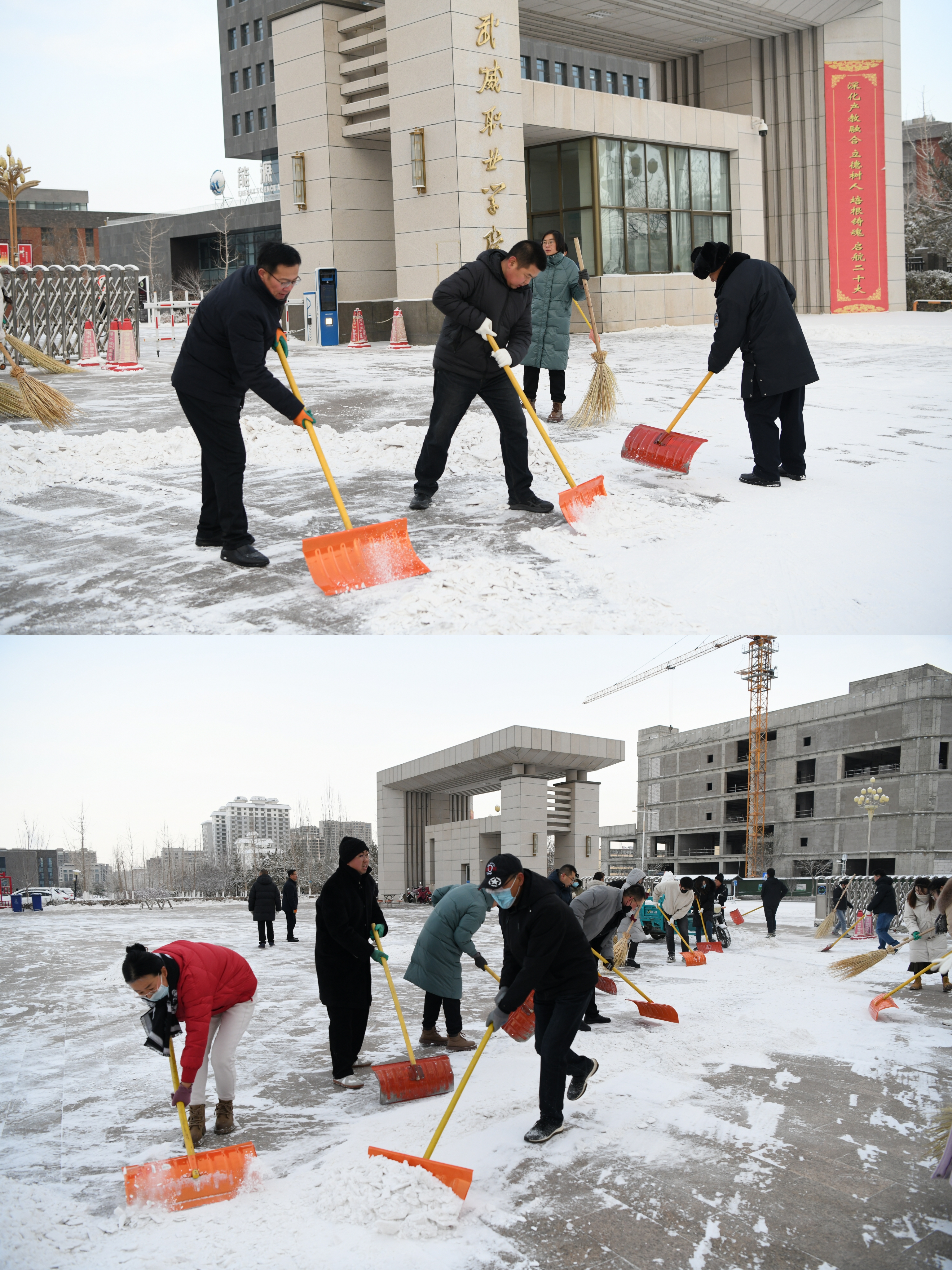 在校長、黨委副書記張開禮的帶領(lǐng)下,老師們都積極行動(dòng)起來,拿上鐵鍬、掃帚清掃校內(nèi)積雪。天氣雖然寒冷,但是大家的熱情卻溫暖了校園的每一個(gè)角落。老師們分工有序、干勁十足,不停的揮舞著手中的掃雪工具,積雪很快就被打掃干凈,消除了安全隱患。