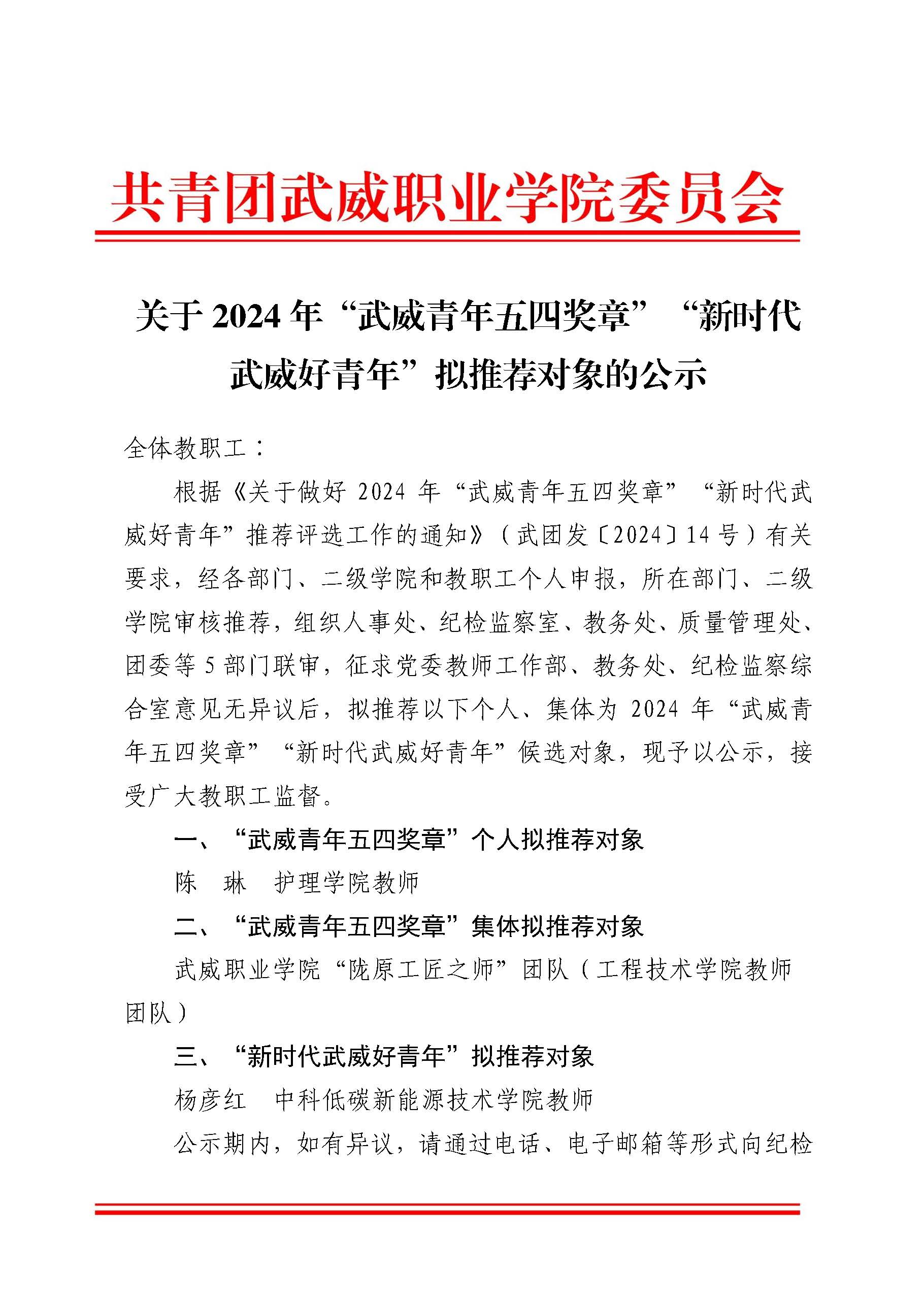 關(guān)于2024年“武威青年五四獎?wù)隆啊毙聲r(shí)代武威好青年“擬推薦對象的公示